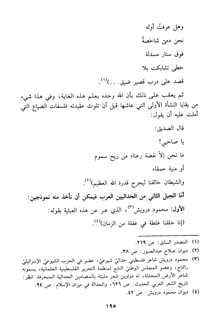 (¬٣) محمود درويش شاعر فلسطيني حداثي شيوعيّ، عضو في الحزب الشيوعيّ الإسرائيلىّ راكاح، وعضو المجلس الوطني التابع لمنظمة التحرير الفلسطينية العلمانية، يسمونه شاعر الأرض المحتلة، له دواوين شعر مليئة بالمضامين الحداثية المنحرفة. انظر: تاريخ الشعر العربي الحديث: ص ٦٢٦، والحداثة في ميزان الإسلام: ص ٩٤.