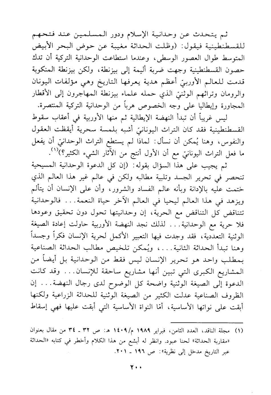 ثم يتحدث عن وحدانية الإسلام ودور المسلمين عند فتحهم للقسطنطينية فيقول: (وظلت الحداثة مغيبة عن حوض البحر الأبيض المتوسط طوال العصور الوسطى، وعندما استطاعت الوحدانية التركية أن تدك حصون القسطنطينية وجهت ضربة أليمة إلى بيزنطة، ولكن بيزنطة المنكوبة قدمت للعالم الأوربي أعظم هدية يعرفها التاريخ وهي مؤلفات اليونان والرومان وتراثهم الوثنيّ الذي حمله علماء بيزنطة المهاجرون إلى الأقطار المجاورة وإيطاليا على وجه الخصوص هربًا من الوحدانية التركية المنتصرة.