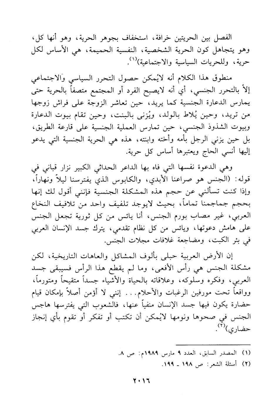 وهي الدعوة نفسها التي فاه بها الداعر الحداثي الكبير نزار قباني في قوله: (الجنس هو صراعنا الأبدي، والكابوس الذي يفترسنا ليلًا ونهارًا، وإذا كنت تسألني عن حجم هذه المشكلة الجنسية فإنني أقول لك إنها بحجم جماجمنا تمامًا، بحيث لا يوجد تلفيف واحد من تلافيف النخاع العربي، غير مصاب بورم الجنس، أنا يائس من كل ثورية تجعل الجنس على هامش دعوتها، ويائس من كل نظام تقدمي، يترك جسد الإنسان العربي في بئر الكبت، ومضاجعة غلافات مجلات الجنس.