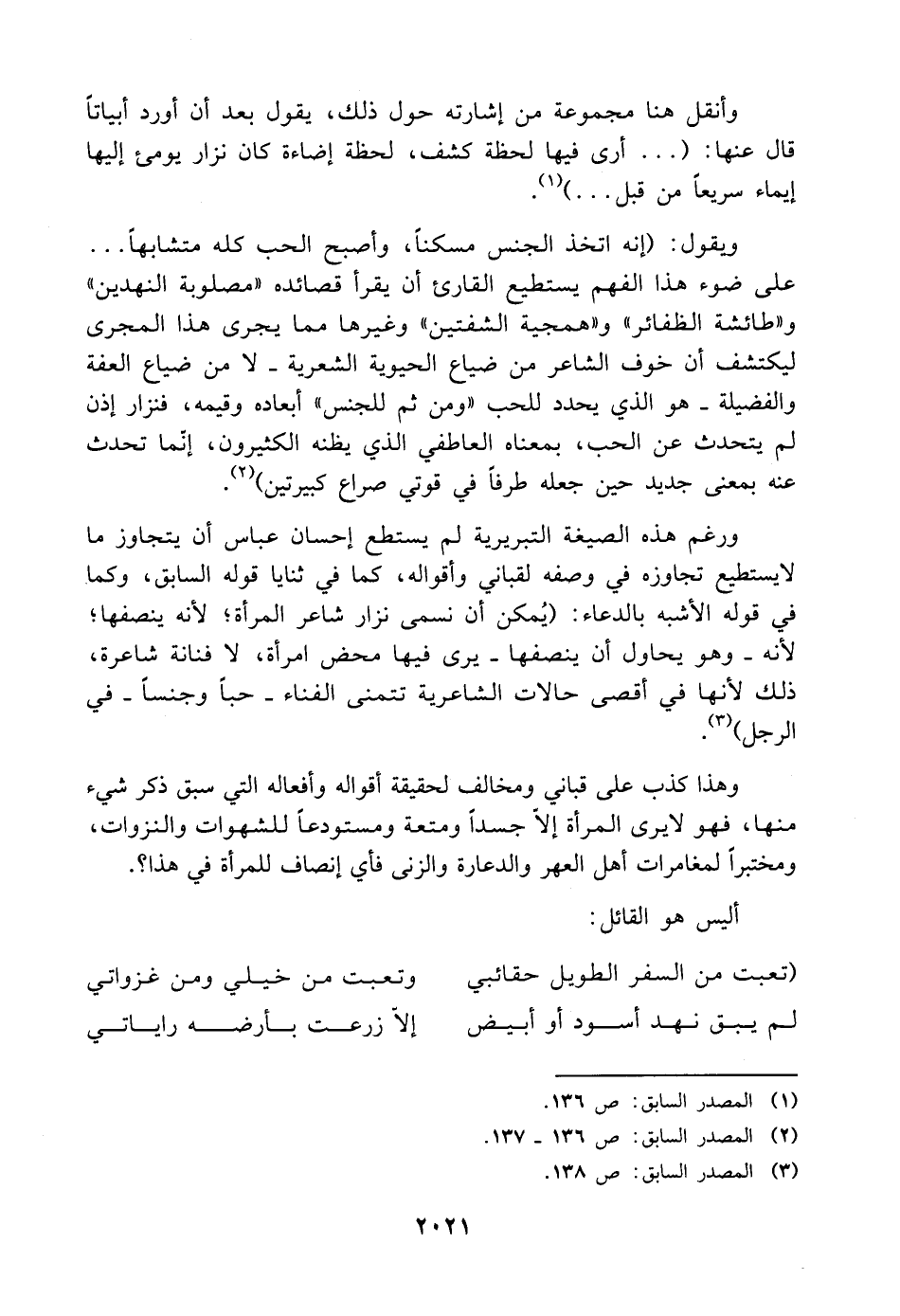 ورغم هذه الصيغة التبريرية لم يستطع إحسان عباس أن يتجاوز ما لا يستطيع تجاوزه في وصفه لقباني وأقواله، كما في ثنايا قوله السابق، وكما. في قوله الأشبه بالدعاء: (يُمكن أن نسمى نزار شاعر المرأة؛ لأنه ينصفها؛ لأنه -وهو يحاول أن ينصفها- يرى فيها محض امرأة، لا فنانة شاعرة، ذلك لأنها في أقصى حالات الشاعرية تتمنى الفناء -حبًا وجنسًا- في الرجل) (¬٣).
