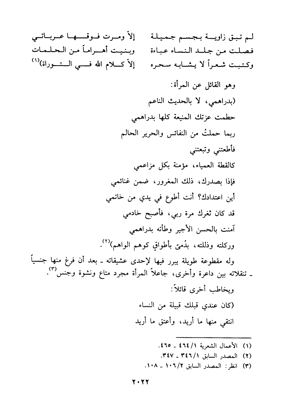وله مقطوعة طويلة يبرر فيها لإحدى عشيقاته -بعد أن فرغ منها جنسيًا- تنقلاته بين داعرة وأخرى، جاعلًا المرأة مجرد متاع ونشوة وجنس (¬٣).