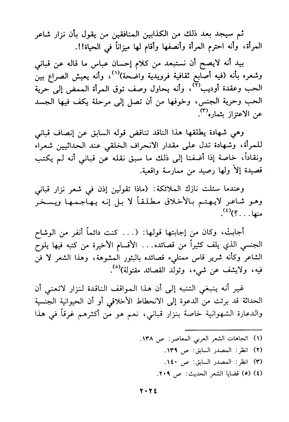 بيد أنه لا يصح أن نستبعد من كلام إحسان عباس ما قاله عن قباني وشعره بأنه (فيه أصابع ثقافية فرويدية واضحة) (¬١)، وأنه يعيش الصراع بين الحب وعقدة أوديب (¬٢)، وأنه يحاول وصف توق المرأة الممض إلى حرية الحب وحرية الجنس، وخوفها من أن تصل إلى مرحلة يكف فيها الجسد عن الاعتزاز بثماره (¬٣).