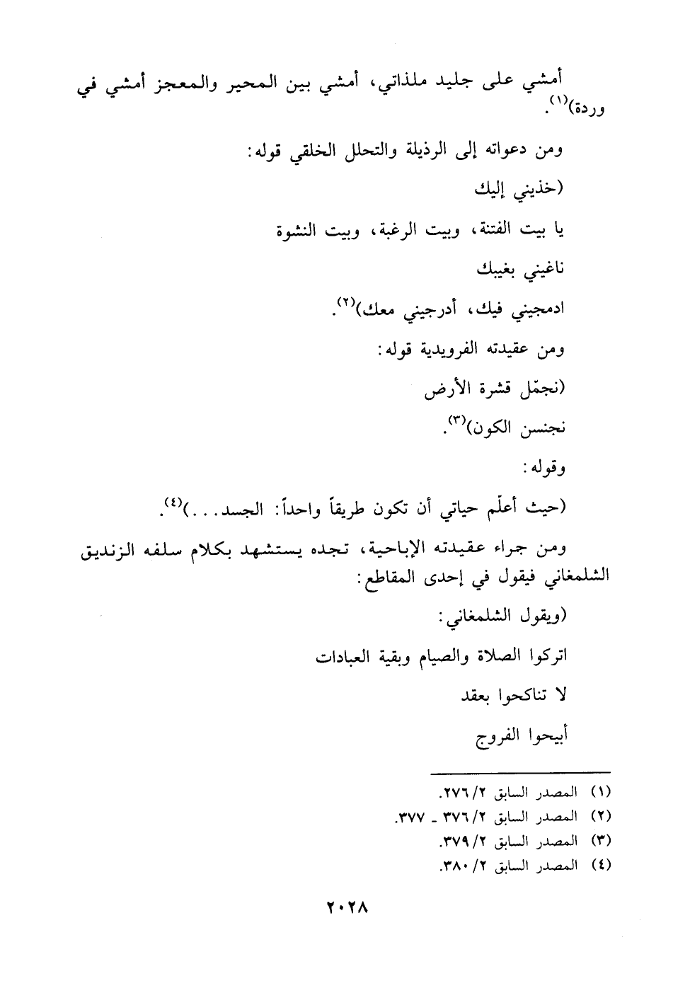 ومن جراء عقيدته الإباحية، تجده يستشهد بكلام سلفه الزنديق الشلمغاني فيقول في إحدى المقاطع: