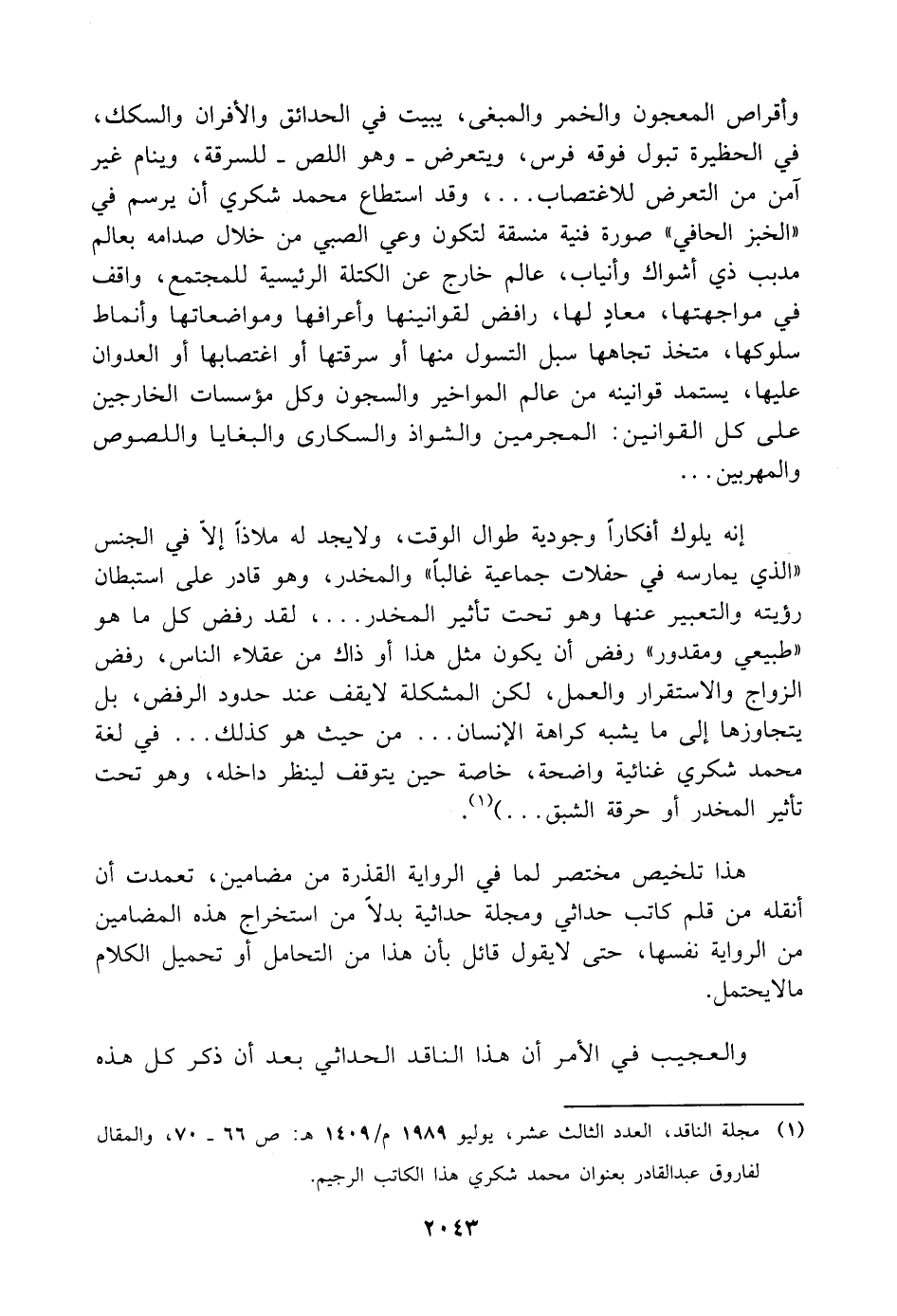 (¬١) مجلة الناقد، العدد الثالث عشر، يوليو ١٩٨٩ م/ ١٤٠٩ هـ: ص ٦٦ - ٧٠، والمقال لفاروق عبد القادر بعنوان محمد شكري هذا الكاتب الرجيم.