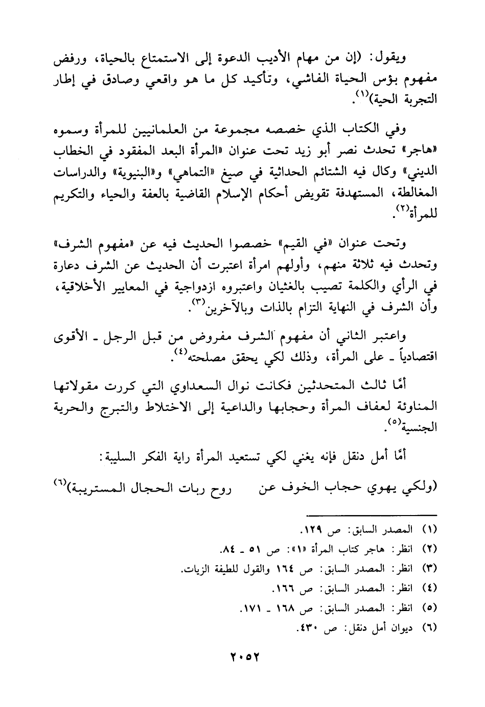 وفي الكتاب الذي خصصه مجموعة من العلمانيين للمرأة وسموه "هاجر" تحدث نصر أبو زيد تحت عنوان "المرأة البعد المفقود في الخطاب الديني" وكال فيه الشتائم الحداثية في صيغ "التماهي" و"البنيوية" والدراسات المغالطة، المستهدفة تقويض أحكام الإسلام القاضية بالعفة والحياء والتكريم للمرأة (¬٢).