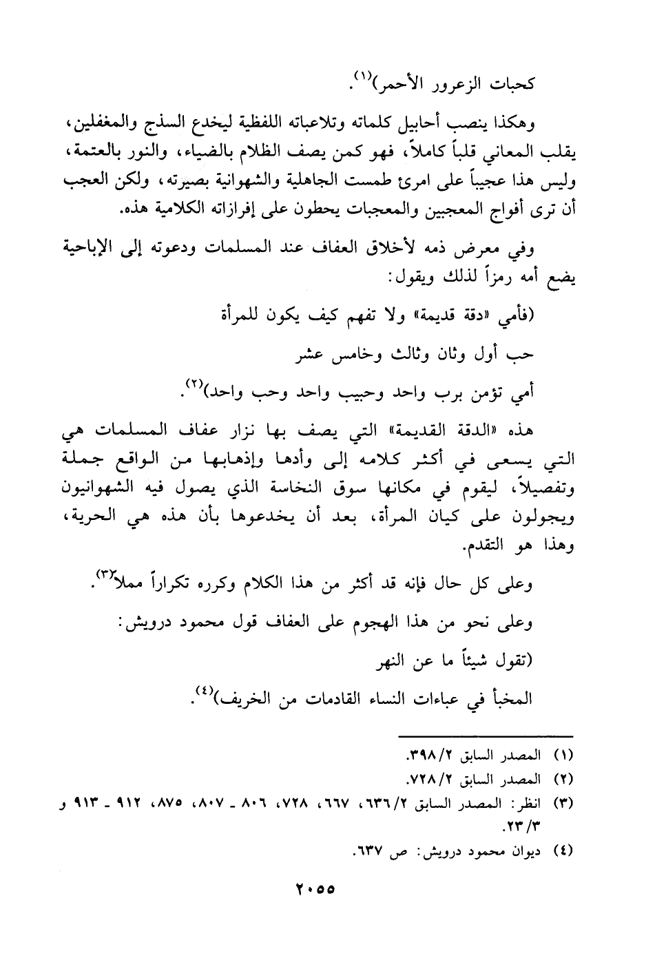 وعلى نحو من هذا الهجوم على العفاف قول محمود درويش: