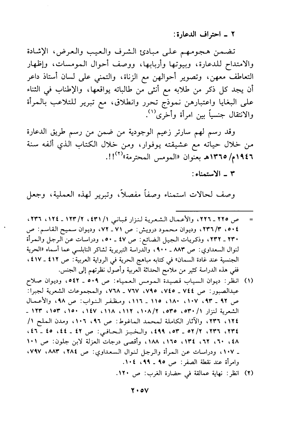 (¬١) انظر: ديوان السياب قصيدة المومس العمياء: ص ٥٠٩ - ٥٤٢، وديوان صلاح عبد الصبور: ص ٧٤٤ - ٧٤٥، ٧٩٥، ٧٦٧ - ٧٦٨، والمجموعات الشعرية لجبرا: ص ٩٢ - ٩٣، ١٠٧، ١٨٠، ١١٥ - ١١٦، ومظفر النواب: ص ٩٨، والأعمال الشعرية لنزار ١/ ٥٣٠، ٥٣٥، ٢/ ١٠٨، ١١٢، ١١٨، ١٤٧، ١٥٠، ١٥٣، ١٢٣ - ١٢٤، ٢٣٦، والآثار الكاملة لمحمد الماغوط: ص ٩٦، ١٠٦، ومدن الملح ١/ ٢٣٤، ٢٣٦، ٢/ ٥٢ - ٥٣، ٤٩٩، والخبز الحافي: ص ٤٢ - ٤٤، ٤٥ - ٤٦، ٤٨، ٦٠، ٦٢، ١٣٤، ١٦٥، ١٨٨، وأقصى درجات العزلة لابن جلون: ص ١٠١ - ١٠٧، ودراسات عن المرأة والرجل لنوال السعداوي: ص ٢٨٤، ٨٨٣، ٧٩٧، وامرأة عند نقطة الصفر: ص ٩٥ - ٩٩، ١٠٤.