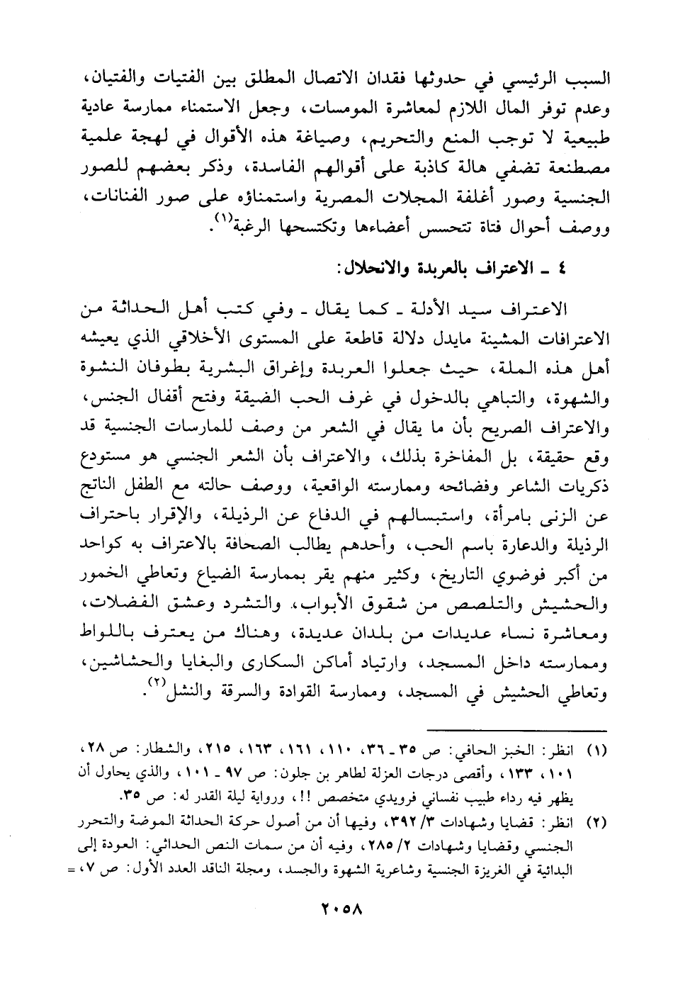 (¬٢) انظر: قضايا وشهادات ٣/ ٣٩٢، وفيها أن من أصول حركة الحداثة الموضة والتحرر الجنسي وقضايا وشهادات ٢/ ٢٨٥، وفيه أن من سمات النص الحداثي: العودة إلى البدائية في الغريزة الجنسية وشاعرية الشهوة والجسد، ومجلة الناقد العدد الأول: ص ٧، =