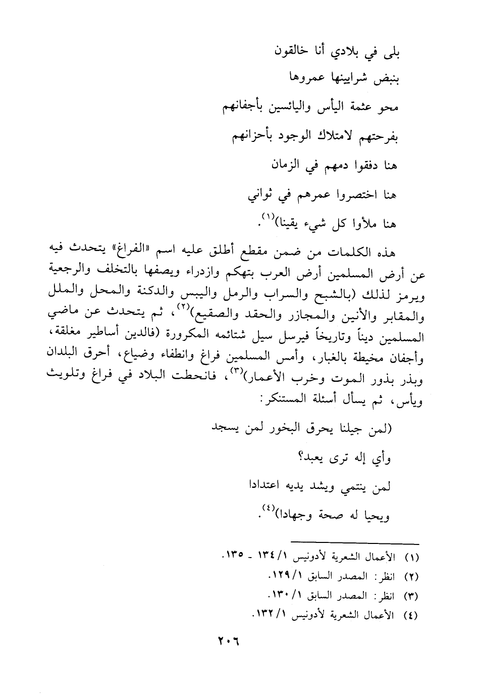 هذه الكلمات من ضمن مقطع أطلق عليه اسم "الفراغ" يتحدث فيه عن أرض المسلمين أرض العرب بتهكم وازدراء ويصفها بالتخلف والرجعية ويرمز لذلك (بالشبح والسراب والرمل واليبس والدكنة والمحل والملل والمقابر والأنين والمجازر والحقد والصقيع) (¬٢)، ثم يتحدث عن ماضي المسلمين دينًا وتاريخًا فيرسل سيل شتائمه المكرورة (فالدين أساطير مغلقة، وأجفان مخيطة بالغبار، وأص المسلمين فراغ وانطفاء وضياع، أحرق البلدان وبذر بذور الموت وخرب الأعمار) (¬٣)، فانحطت البلاد في فراغ وتلويث ويأس، ثم يسأل أسئلة المستنكر: