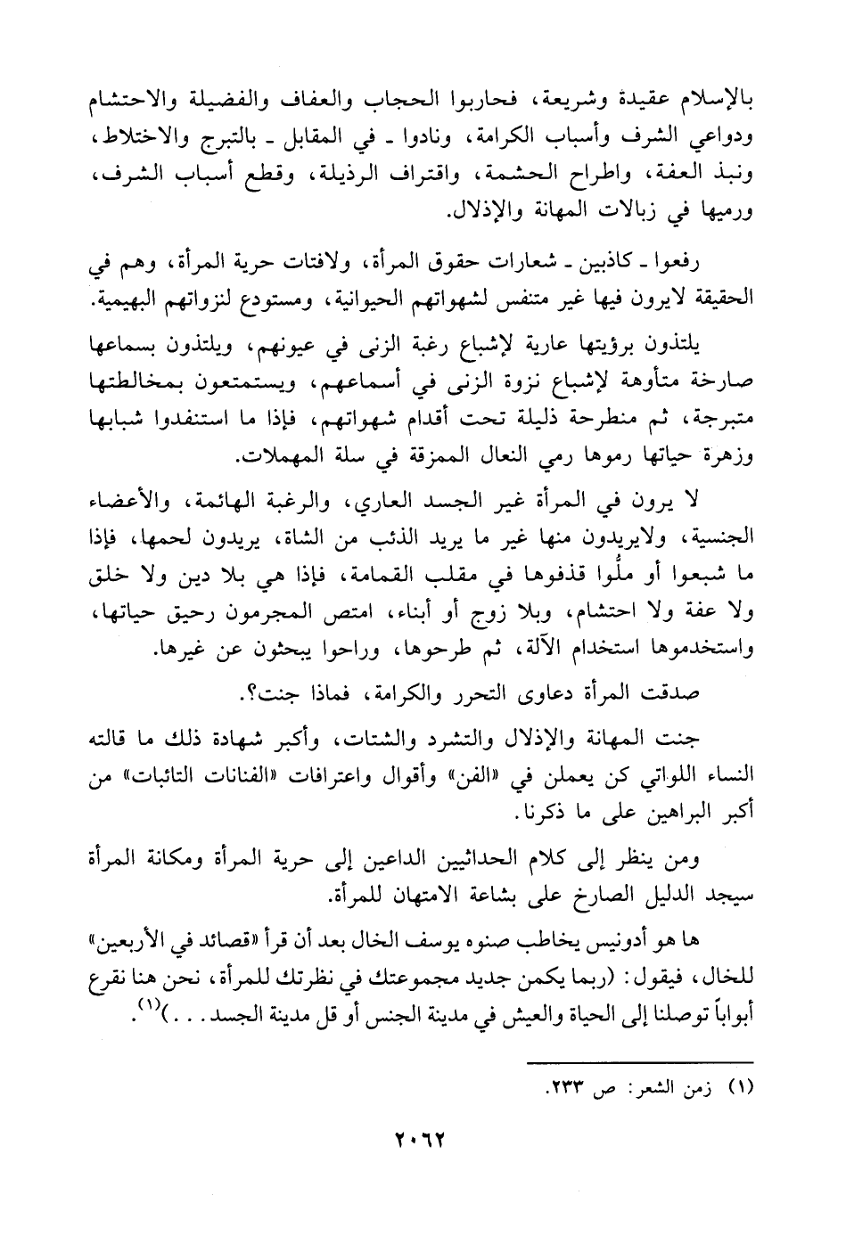 ومن ينظر إلى كلام الحداثيين الداعين إلى حرية المرأة ومكانة المرأة سيجد الدليل الصارخ على بشاعة الامتهان للمرأة.