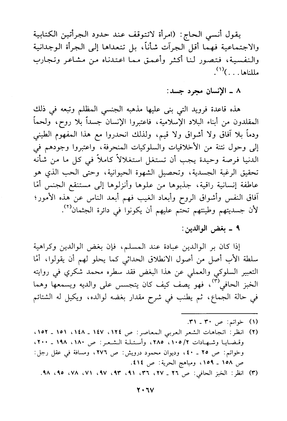 هذه قاعدة فرويد التي بنى عليها مذهبه الجنسي المظلم وتبعه في ذلك المقلدون من أبناء البلاد الإسلامية، فاعتبروا الإنسان جسدًا بلا روح، ولحمًا ودمًا بلا آفاق ولا أشواق ولا قيم، ولذلك انحدروا مع هذا المفهوم الطيني إلى وحول نتنة من الأخلاقيات والسلوكيات المنحرفة، واعتبروا وجودهم في الدنيا فرصة وحيدة يجب أن تستغل استغلالًا كاملًا في كل ما من شأنه تحقيق الرغبة الجسدية، وتحصيل الشهوة الحيوانية، وحتى الحب الذي هو عاطفة إنسانية راقية، جذبوها من علوها وأنزلوها إلى مستنقع الجنس أمّا آفاق النفس وأشواق الروح وأبعاد الغيب فهم أبعد الناس عن هذه الأمور؛ لأن جسديتهم وطينتهم تحتم عليهم أن يكونوا في دائرة الجثمان (¬٢).