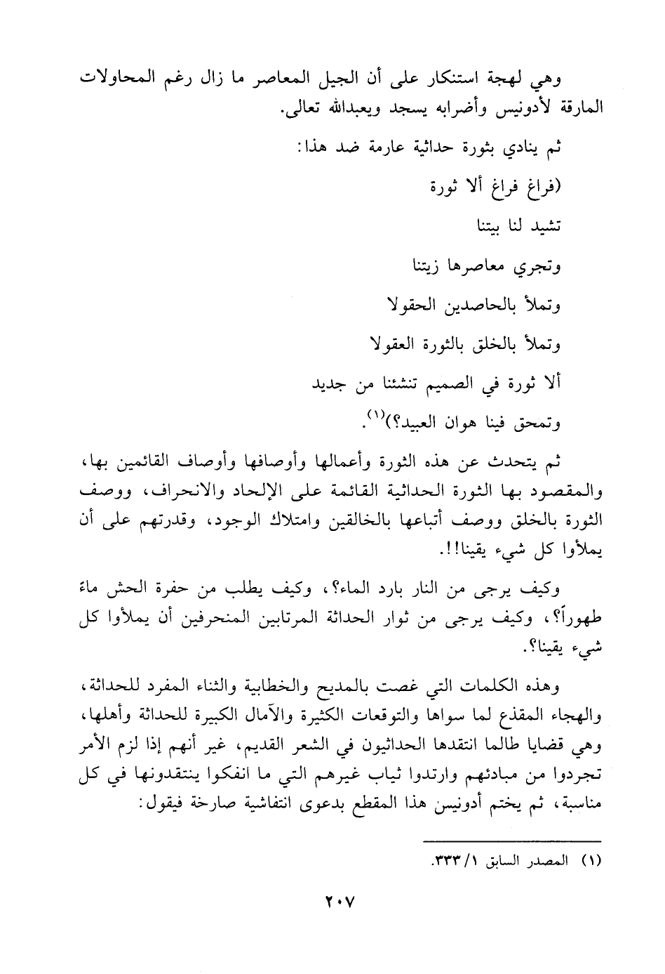 وهذه الكلمات التي غصت بالمديح والخطابية والثناء المفرد للحداثة، والهجاء المقذع لما سواها والتوقعات الكثيرة والآمال الكبيرة للحداثة وأهلها، وهي قضايا طالما انتقدها الحداثيون في الشعر القديم، غير أنهم إذا لزم الأمر تجردوا من مبادئهم وارتدوا ثياب غيرهم التي ما انفكوا ينتقدونها في كل مناسبة، ثم يختم أدونيس هذا المقطع بدعوى انتفاشية صارخة فيقول: