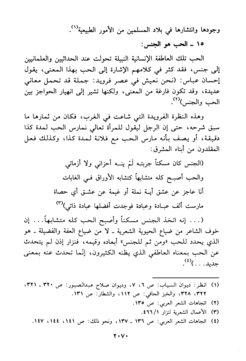 (. . . إنه اتخذ الجنس مسكنًا وأصبح الحب كله متشابهًا. . . إن خوف الشاعر من ضياع الحيوية الشعرية -لا من ضياع العفة والفضيلة- هو الذي يحدد للحب "ومن ثم للجنس" أبعاده وقيمه، فنزار إذن لم يتحدث عن الحب بمعناه العاطفي الذي يظنه الكثيرون، إنّما تحدث عنه بمعنى جديد. . .) (¬٤).