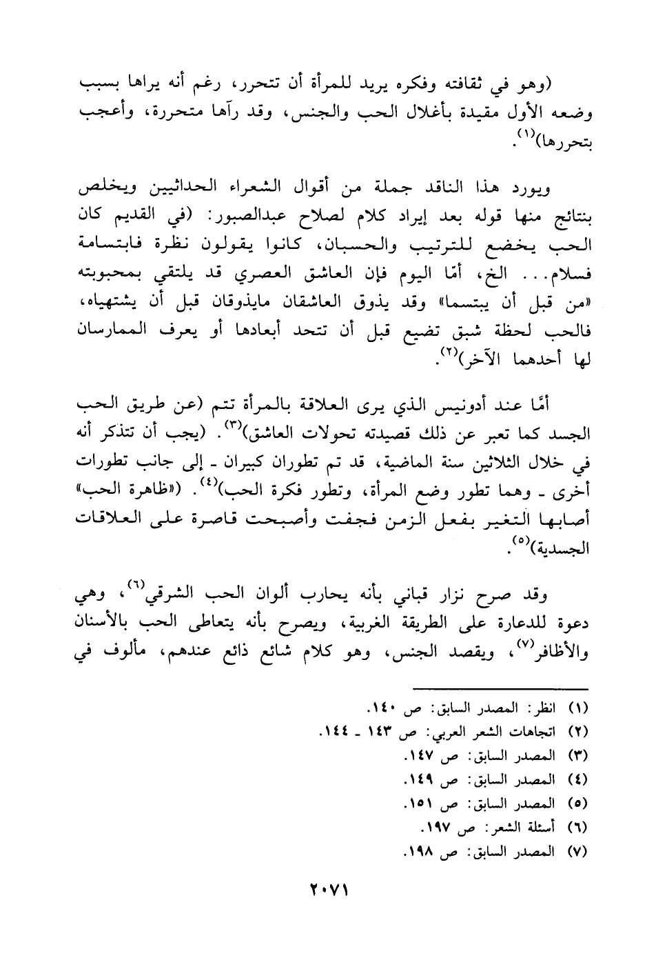 ويورد هذا الناقد جملة من أقوال الشعراء الحداثيين ويخلص بنتائج منها قوله بعد إيراد كلام لصلاح عبد الصبور: (في القديم كان الحب يخضع للترتيب والحسبان، كانوا يقولون نظرة فابتسامة فسلام. . . الخ، أمّا اليوم فإن العاشق العصري قد يلتقي بمحبوبته "من قبل أن يبتسما" وقد يذوق العاشقان ما يذوقان قبل أن يشتهياه، فالحب لحظة شبق تضيع قبل أن تتحد أبعادها أو يعرف الممارسان لها أحدهما الآخر) (¬٢).