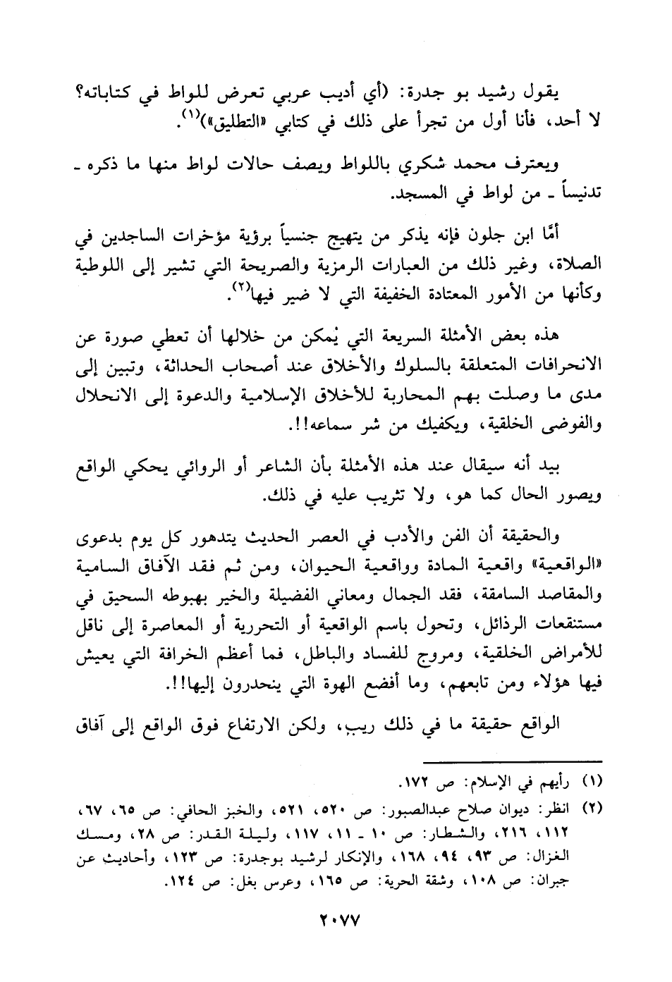 والحقيقة أن الفن والأدب في العصر الحديث يتدهور كل يوم بدعوى "الواقعية" واقعية المادة وواقعية الحيوان، ومن ثم فقد الآفاق السامية والمقاصد السامقة، فقد الجمال ومعاني الفضيلة والخير بهبوطه السحيق في مستنقعات الرذائل، وتحول باسم الواقعية أو التحررية أو المعاصرة إلى ناقل للأمراض الخلقية، ومروج للفساد والباطل، فما أعظم الخرافة التي يعيش فيها هؤلاء ومن تابعهم، وما أفضع الهوة التي ينحدرون إليها! ! .