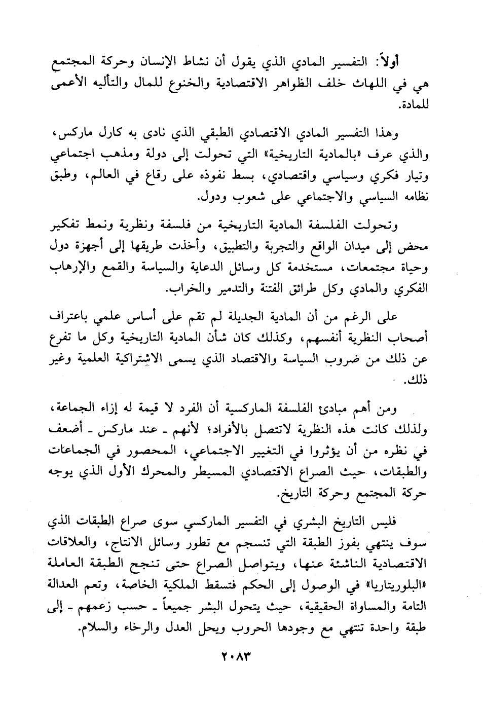 أولًا: التفسير المادي الذي يقول أن نشاط الإنسان وحركة المجتمع هي في اللهاث خلف الظواهر الاقتصادية والخنوع للمال والتأليه الأعمى للمادة.