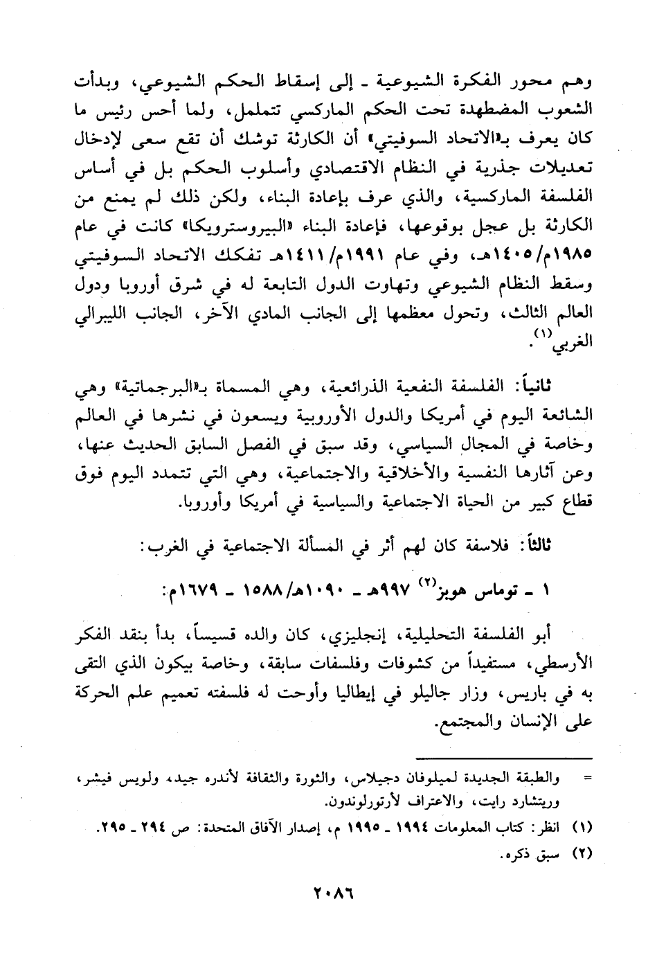 وهم محور الفكرة الشيوعية- إلى إسقاط الحكم الشيوعي، وبدأت الشعوب المضطهدة تحت الحكم الماركسي تتململ، ولما أحس رئيس ما كان يعرف بـ "الاتحاد السوفيتي" أن الكارثة توشك أن تقع سعى لإدخال تعديلات جذرية في النظام الاقتصادي وأسلوب الحكم بل في أساس الفلسفة الماركسية، والذي عرف بإعادة البناء، ولكن ذلك لم يمنع من الكارثة بل عجل بوقوعها، فإعادة البناء "البيروسترويكا" كانت في عام ١٩٨٥ م/ ١٤٠٥ هـ، وفي عام ١٩٩١ م/ ١٤١١ هـ تفكك الاتحاد السوفيتي وسقط النظام الشيوعي وتهاوت الدول التابعة له في شرق أوروبا ودول العالم الثالث، وتحول معظمها إلى الجانب المادي الآخر، الجانب الليبرالي الغربي (¬١).