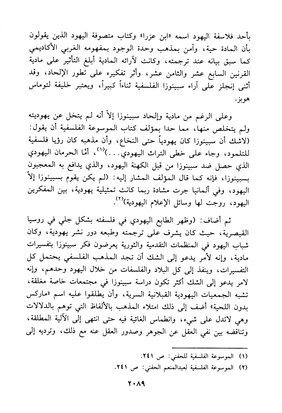 ثم أضاف: (وظهر الطابع اليهودي في فلسفته بشكل جلي في روسيا القيصرية، حيث كان يشرف على ترجمته وطبعه دور نشر يهودية، وكان شباب اليهود في المنظمات التقدمية والثورية يعرضون فكر سبينوزا بتفسيرات مادية، وإنه لأمر يدعو إلى الشك أن تجد المذهب الفلسفي يحتمل كل التفسيرات، وينفذ إلى كل البلاد والفلسفات من خلال اليهود وحدهم، وإنه لامر يدعو إلى الشك أكثر تكون دراسة سبينوزا في مجتمعات خاصة مغلقة، تشبه الجمعيات اليهودية القبلانية السرية، وأن يطلقوا عليه اسم "ماركس بدون اللحية" أضف إلى ذلك امتلاء المذهب بالألفاظ التي توهم بالدلالات وهي لا تدل على شيء، وانطماس الغائية فيه حتى انتهى إلى الآلية المطلقة، وتناقضه بين نفي العقل عن الجوهر وصدور العقل عنه مع ذلك، وترديه إلى
