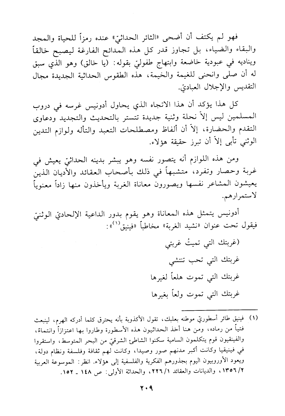 (¬١) فينيق طائر أسطوريّ موطنه بعلبك، تقول الأكذوبة بأنه يحترق كلما أدركه الهرم، لينبعث فتيًا من رماده، ومن هنا أخذ الحداثيون هذه الأسطورة وطاروا بها اعتزازًا وانتماءً، والفينقيون قوم يتكلمون السامية سكنوا الشاطئ الشرقيّ من البحر المتوسط، واستقروا في فينيقيا وكانت أكبر مدنهم صور وصيدًا، وكانت لهم ثقافة وفلسفة ونظام دولة، ويعود الأوروبيون اليوم بجذورهم الفكرية والفلسفية إلى هؤلاء. انظر: الموسوعة العربية ٢/ ١٣٥٦، والديانات والعقائد ١/ ٢٢٦، والحداثة الأولى: ص ١٤٨ - ١٥٢.
