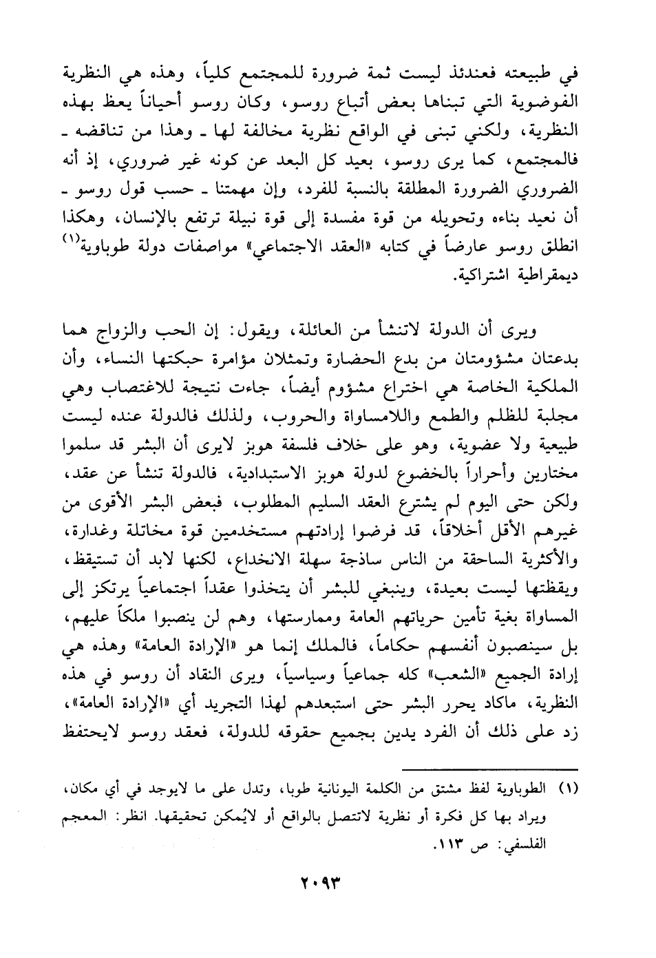 في طبيعته فعندئذ ليست ثمة ضرورة للمجتمع كليًا، وهذه هي النظرية الفوضوية التي تبناها بعض أتباع روسو، وكان روسو أحيانًا يعظ بهذه النظرية، ولكني تبنى في الواقع نظرية مخالفة لها -وهذا من تناقضه- فالمجتمع، كما يرى روسو، بعيد كل البعد عن كونه غير ضروري، إذ أنه الضروري الضرورة المطلقة بالنسبة للفرد، وإن مهمتنا -حسب قول روسو- أن نعيد بناءه وتحويله من قوة مفسدة إلى قوة نبيلة ترتفع بالإنسان، وهكذا انطلق روسو عارضًا في كتابه "العقد الاجتماعي" مواصفات دولة طوباوية (¬١) ديمقراطية اشتراكية.