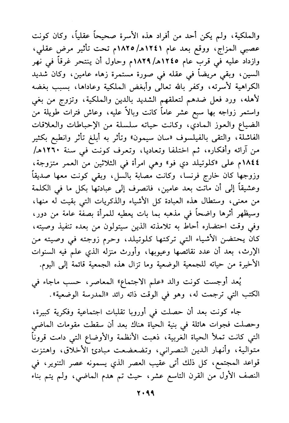 والملكية، ولم يكن أحد من أفراد هذه الأسرة صحيحًا عقليًا، وكان كونت عصبي المزاج، ووقع بعد عام ١٢٤١ هـ/ ١٨٢٥ م تحت تأثير مرض عقلي، وازداد عليه في قرب عام ١٢٤٥ هـ/ ١٨٢٩ م وحاول أن ينتحر غرقًا في نهر السين، وبقي مريضًا في عقله في صورة مستمرة زهاء عامين، وكان شديد الكراهية لأسرته، وكفر باللَّه تعالى وأبغض الملكية وعاداها، بسبب بغضه لأهله، ورد فعل ضدهم لتعلقهم الشديد بالدين والملكية، وتزوج من بغي واستمر زواجه بها سبع عشر عامًا كانت وبالًا عليه، وعاش فترات طويلة من الضياع والعوز المادي، وكانت حياته سلسلة من الإحباطات والعلاقات الفاشلة، والتقى بالفيلسوف "سان سيمون" وتأثر به أبلغ تأثر وانطبع بكثير من آرائه وأفكاره، ثم اختلفا وتعاديا، وتعرف كونت في سنة ١٢٦٠ هـ/ ١٨٤٤ م على "كلوتيلد دي فو" وهي امرأة في الثلاثين من العمر متزوجة، وزوجها كان خارج فرنسا، وكانت مصابة بالسل، وبقي كونت معها صديقًا وعشيقًا إلى أن ماتت بعد عامين، فانصرف إلى عبادتها بكل ما في الكلمة من معنى، وستطال هذه العبادة كل الأشياء والذكريات التي بقيت له منها، وسيظهر أثرها واضحًا في مذهبه بما بات يعطيه للمرأة بصفة عامة من دور، وفي وقت احتضاره أحاط به تلامذته الذين سيتولون من بعده تنفيذ وصيته، كان يحتضن الأشياء التي تركتها كلوتيلد، وحرم زوجته في وصيته من الإرث، بعد أن عدد نقائصها وعيوبها، وأورث منزله الذي علم فيه السنوات الأخيرة من حياته للجمعية الوضعية وما تزال هذه الجمعية قائمة إلى اليوم.