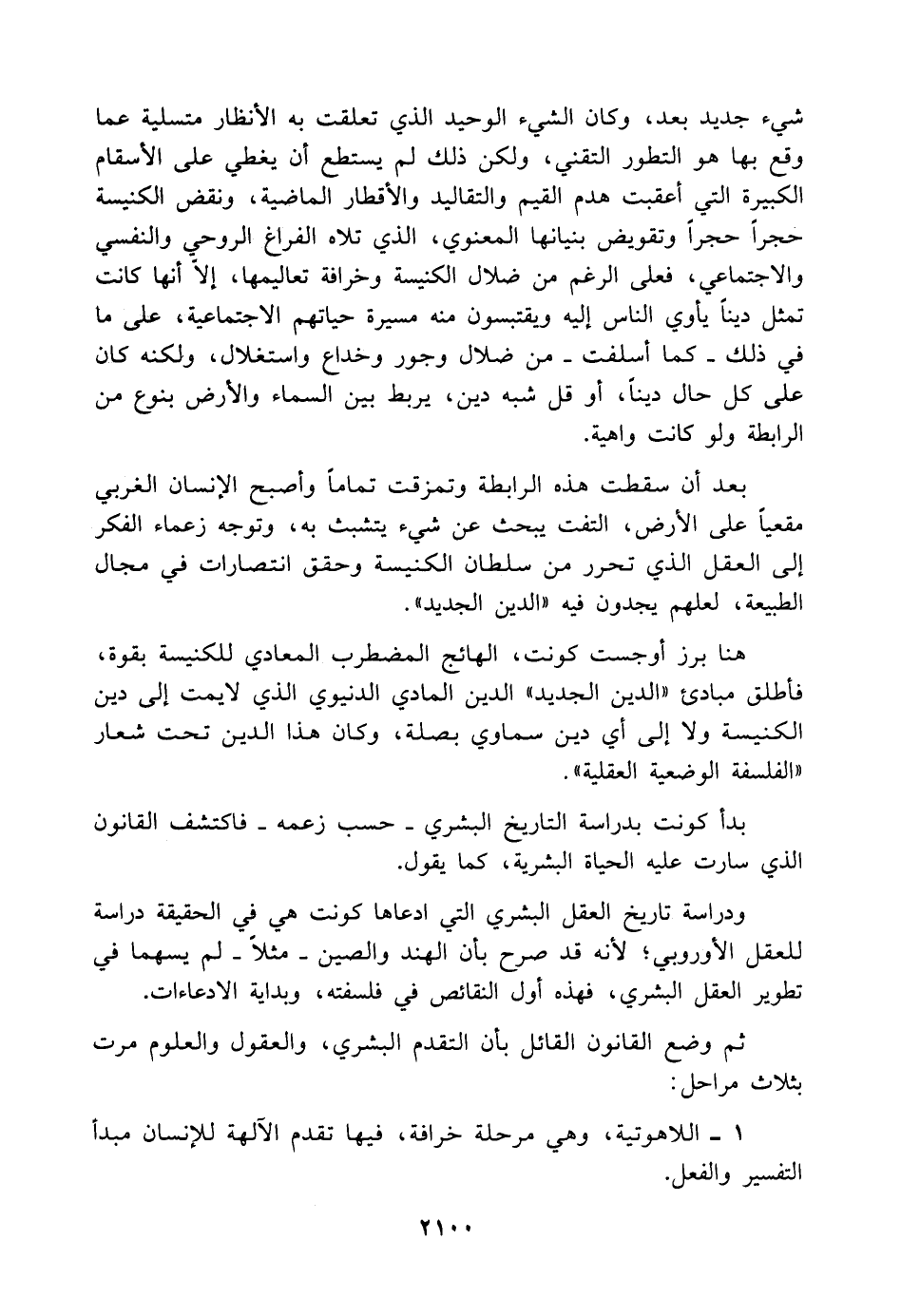 شيء جديد بعد، وكان الشيء الوحيد الذي تعلقت به الأنظار متسلية عما وقع بها هو التطور التقني، ولكن ذلك لم يستطع أن يغطي على الأسقام الكبيرة التي أعقبت هدم القيم والتقاليد والأقطار الماضية، ونقض الكنيسة حجرًا حجرًا وتقويض بنيانها المعنوي، الذي تلاه الفراغ الروحي والنفسي والاجتماعي، فعلى الرغم من ضلال الكنيسة وخرافة تعاليمها، إلّا أنها كانت تمثل دينًا يأوي الناس إليه ويقتبسون منه مسيرة حياتهم الاجتماعية، على ما في ذلك -كما أسلفت- من ضلال وجور وخداع واستغلال، ولكنه كان على كل حال دينًا، أو قل شبه دين، يربط بين السماء والأرض بنوع من الرابطة ولو كانت واهية.
