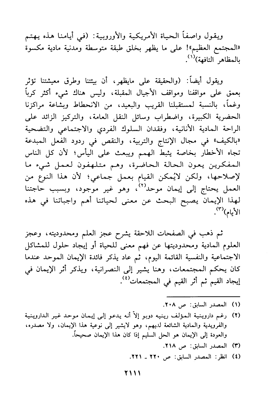 ثم ذهب في الصفحات اللاحقة يشرح عجز العلم ومحدوديته، وعجز العلوم المادية ومحدوديتها عن فهم معنى للحياة أو إيجاد حلول للمشاكل الاجتماعية والنفسية القائمة اليوم، ثم عاد يذكر فائدة الإيمان الموحد عندما كان يحكم المجتمعات، وهنا يشير إلى النصرانية، ويذكر أثر الإيمان في إيجاد القيم ثم أثر القيم في المجتمعات (¬٤).