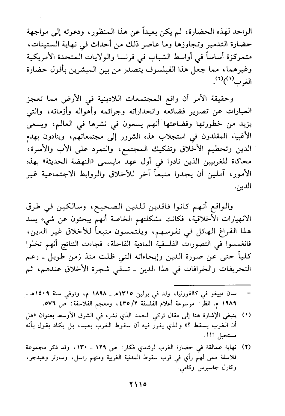 (¬٢) نهاية عمالقة في حضارة الغرب لرشدي فكار: ص ١٢٩ - ١٣٠، وقد ذكر مجموعة فلاسفة ممن لهم رأي في قرب سقوط المدنية الغربية ومنهم راسل، وسارتر وهيدجر، وكارل جاسبرس وكامي.