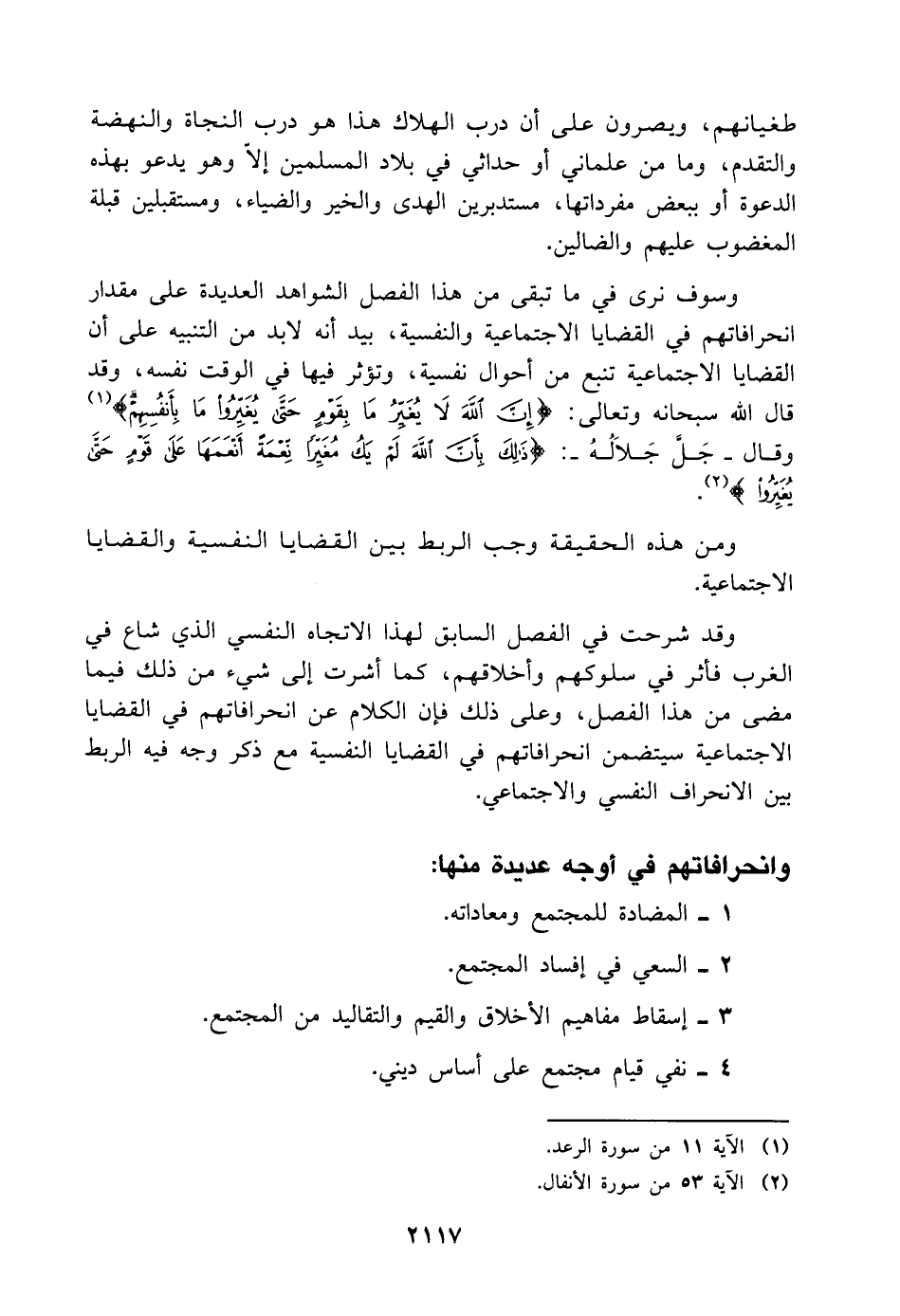 وسوف نرى في ما تبقى من هذا الفصل الشواهد العديدة على مقدار انحرافاتهم في القضايا الاجتماعية والنفسية، بيد أنه لابد من التنبيه على أن القضايا الاجتماعية تنبع من أحوال نفسية، وتؤثر فيها في الوقت نفسه، وقد قال اللَّه سبحانه وتعالى: {إِنَّ اللَّهَ لَا يُغَيِّرُ مَا بِقَوْمٍ حَتَّى يُغَيِّرُوا مَا بِأَنْفُسِهِمْ} (¬١) وقال -جَلَّ جَلَالُهُ-: {ذَلِكَ بِأَنَّ اللَّهَ لَمْ يَكُ مُغَيِّرًا نِعْمَةً أَنْعَمَهَا عَلَى قَوْمٍ حَتَّى يُغَيِّرُوا} (¬٢).