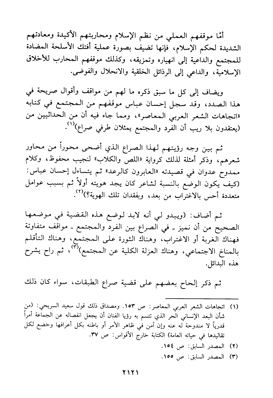 (¬١) اتجاهات الشعر العربي المعاصر: ص ١٥٣. ومصداق ذلك قول سعيد السريحي: (من شأن البعد الإنساني الحر الذي تتسم به رؤيا الفنان أن يجعل انفصاله عن الجماعة أمرًا قدريًا لا مندوحة له عنه دهان آمن في ظاهر الأمر أو باطنه بكل أعرافها وخضع لكل تقاليدها في حياته العامة) الكتابة خارج الأقواس: ص ٣٧.