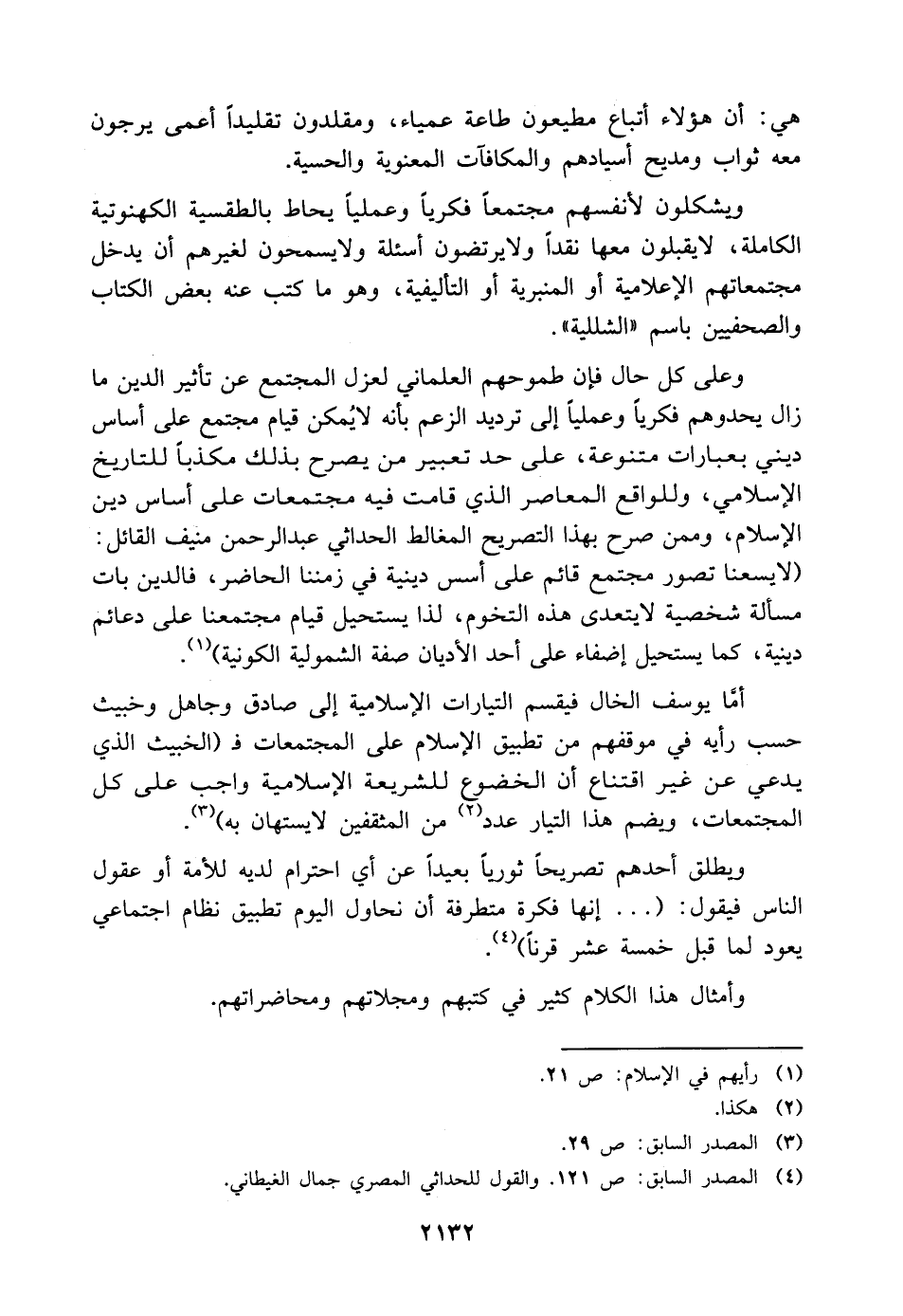 وعلى كل حال فإن طموحهم العلماني لعزل المجتمع عن تأثير الدين ما زال يحدوهم فكريًا وعمليًا إلى ترديد الزعم بأنه لا يُمكن قيام مجتمع على أساس ديني بعبارات متنوعة، على حد تعبير من يصرح بذلك مكذبًا للتاريخ الإسلامي، وللواقع المعاصر الذي قامت فيه مجتمعات على أساس دين الإسلام، وممن صرح بهذا التصريح المغالط الحداثي عبد الرحمن منيف القائل: (لا يسعنا تصور مجتمع قائم على أسس دينية في زمننا الحاضر، فالدين بات مسألة شخصية لا يتعدى هذه التخوم، لذا يستحيل قيام مجتمعنا على دعائم دينية، كما يستحيل إضفاء على أحد الأديان صفة الشمولية الكونية) (¬١).