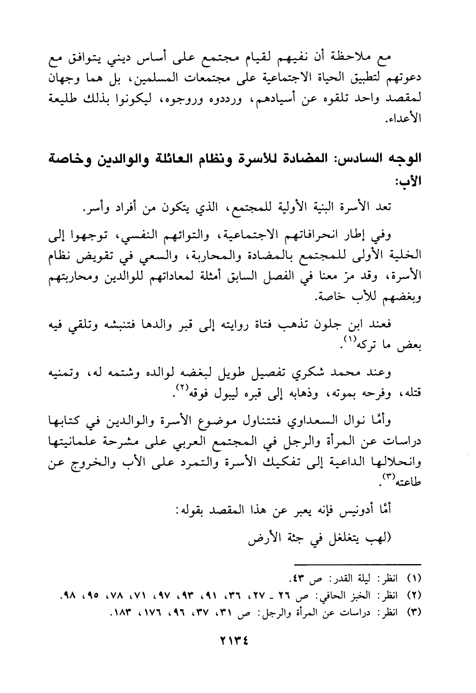 وأمَّا نوال السعداوي فتتناول موضوع الأسرة والوالدين في كتابها دراسات عن المرأة والرجل في المجتمع العربي على مشرحة علمانيتها وانحلالها الداعية إلى تفكيك الأسرة والتمرد على الأب والخروج عن طاعته (¬٣).