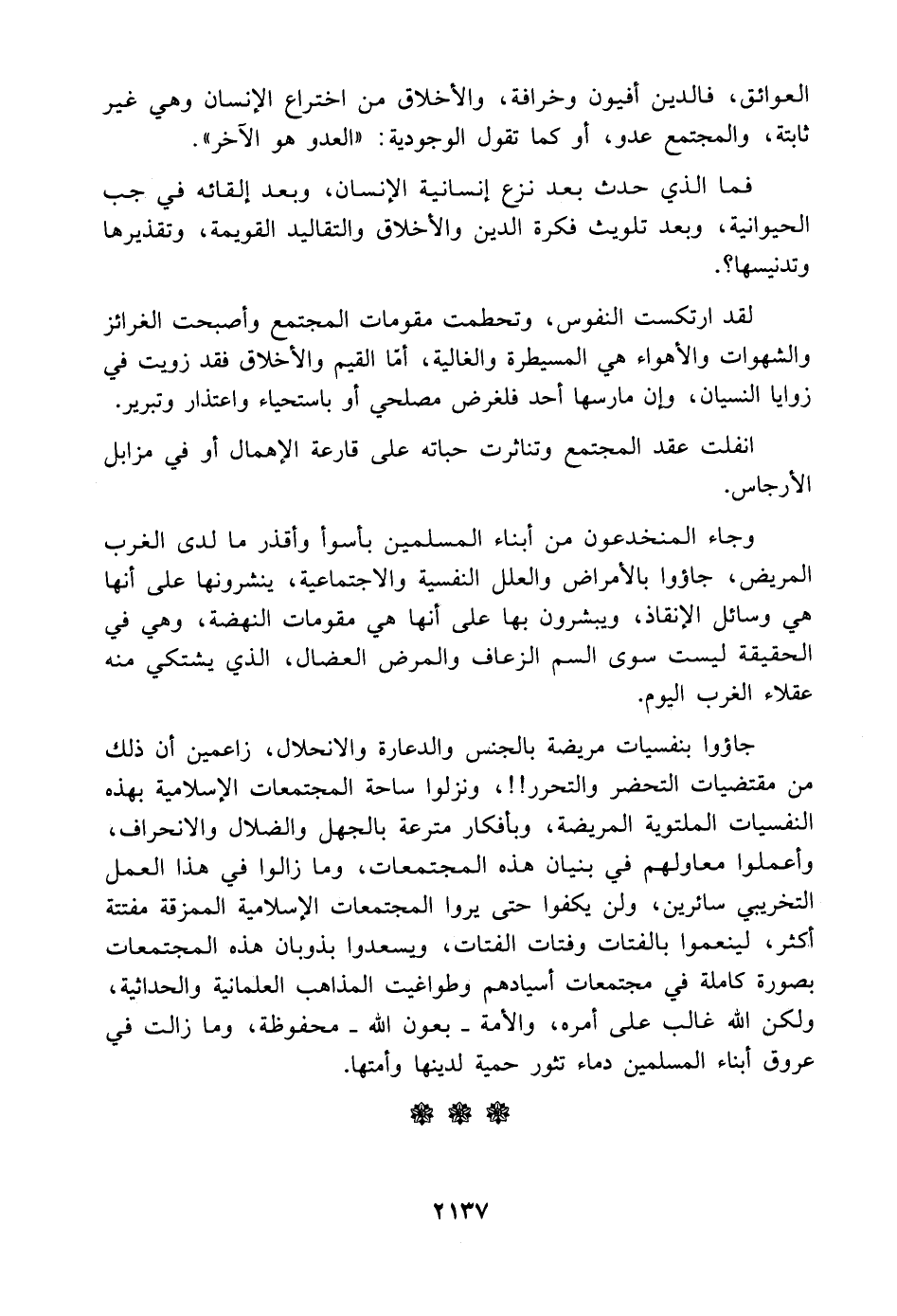 جاؤوا بنفسيات مريضة بالجنس والدعارة والانحلال، زاعمين أن ذلك من مقتضيات التحضر والتحرر! ! ، ونزلوا ساحة المجتمعات الإسلامية بهذه النفسيات الملتوية المريضة، وبأفكار مترعة بالجهل والضلال والانحراف، وأعملوا معاولهم في بنيان هذه المجتمعات، وما زالوا في هذا العمل التخريبي سائرين، ولن يكفوا حتى يروا المجتمعات الإسلامية الممزقة مفتتة أكثر، لينعموا بالفتات وفتات الفتات، ويسعدوا بذوبان هذه المجتمعات بصورة كاملة في مجتمعات أسيادهم وطواغيت المذاهب العلمانية والحداثية، ولكن اللَّه غالب على أمره، والأمة -بعون اللَّه- محفوظة، وما زالت في عروق أبناء المسلمين دماء تثور حمية لدينها وأمتها.