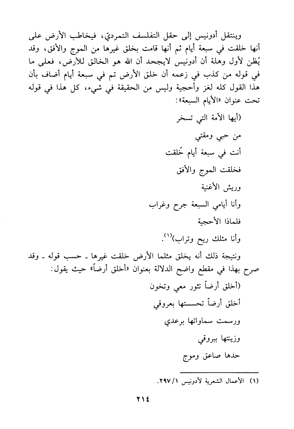 وينتقل أدونيس إلى حقل التفلسف التمرديّ، فيخاطب الأرض على أنها خلقت في سبعة أيام ثم أنها قامت بخلق غيرها من الموج والأفق، وقد يُظن لأول وهلة أن أدونيس لا يجحد أن اللَّه هو الخالق للأرض، فعلى ما في قوله من كذب في زعمه أن خلق الأرض تم في سبعة أيام أضاف بأن هذا القول كله لغز وأحجية وليس من الحقيقة في شيء، كل هذا في قوله تحت عنوان "الأيام السبعة":