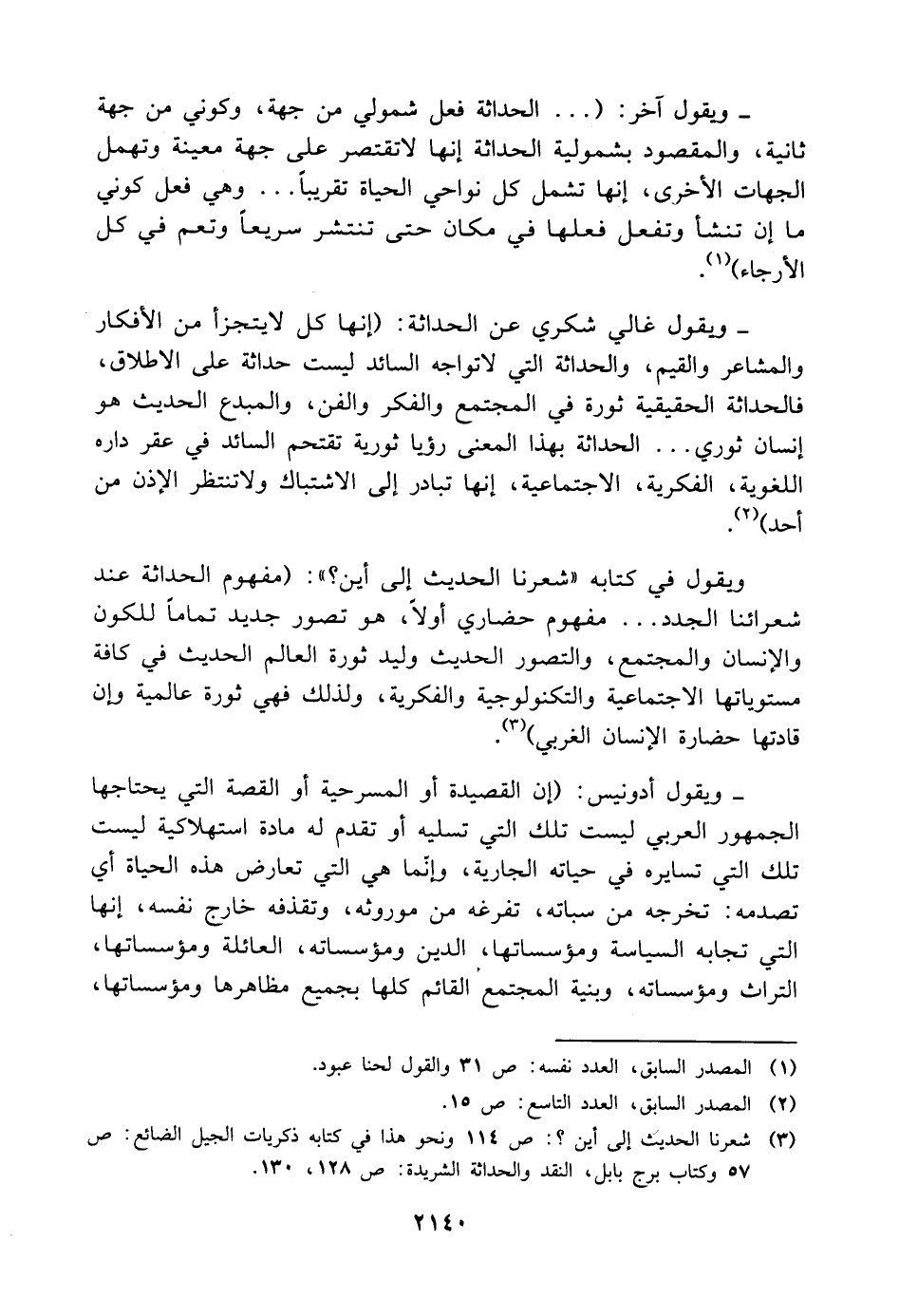 - ويقول آخر: (. . . الحداثة فعل شمولي من جهة، وكوني من جهة ثانية، والمقصود بشمولية الحداثة إنها لا تقتصر على جهة معينة وتهمل الجهات الأخرى، إنها تشمل كل نواحي الحياة تقريبًا. . . وهي فعل كوني ما إن تنشأ وتفعل فعلها في مكان حتى تنتشر سريعًا وتعم في كل الأرجاء) (¬١).
