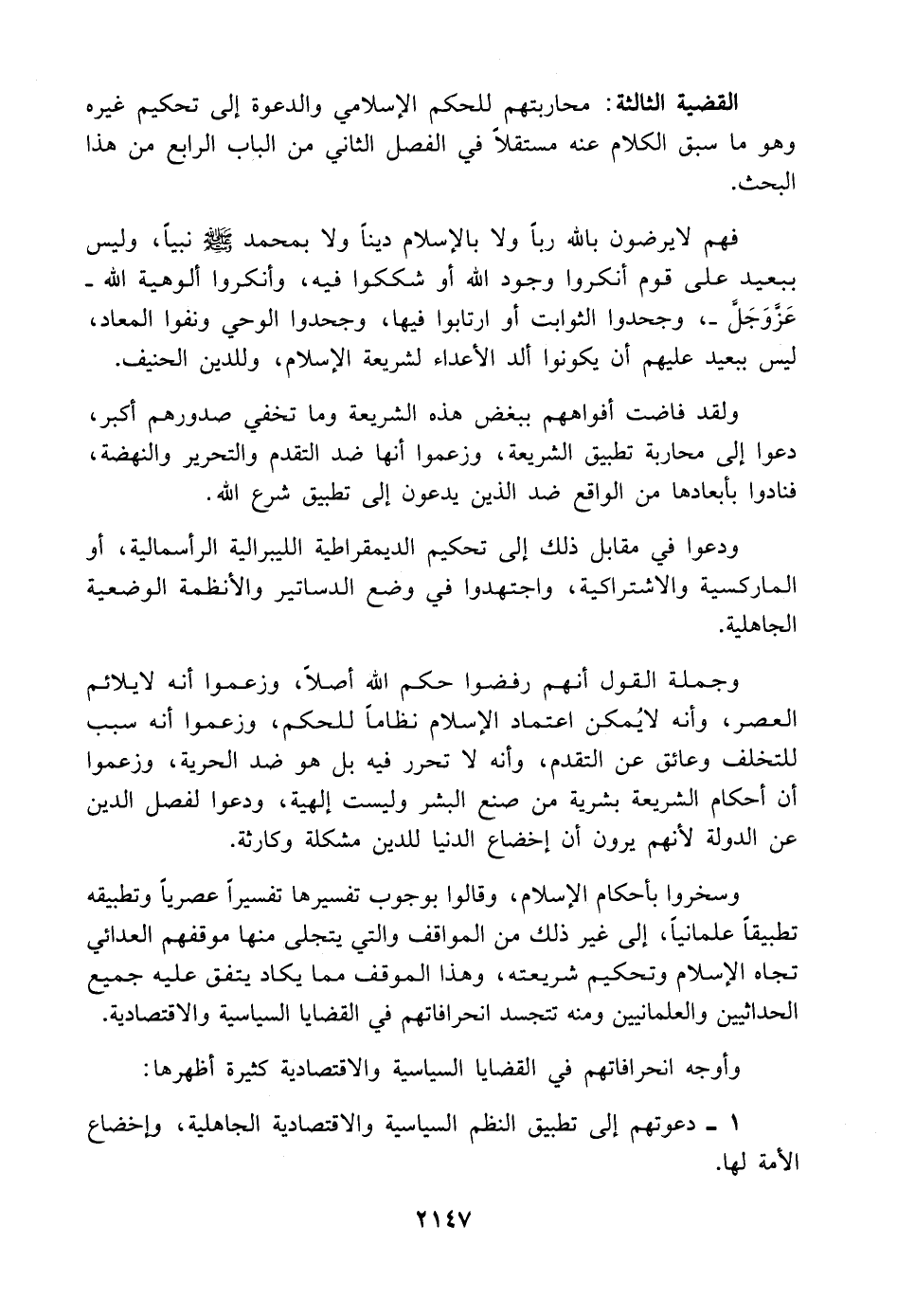 وجملة القول أنهم رفضعوا حكم اللَّه أصلًا، وزعموا أنه لا يلائم العصر، وأنه لا يُمكن اعتماد الإسلام نظامًا للحكم، وزعموا أنه سبب للتخلف وعائق عن التقدم، وأنه لا تحرر فيه بل هو ضد الحرية، وزعموا أن أحكام الشريعة بشرية من صنع البشر وليست إلهية، ودعوا لفصل الدين عن الدولة لأنهم يرون أن إخضاع الدنيا للدين مشكلة وكارثة.