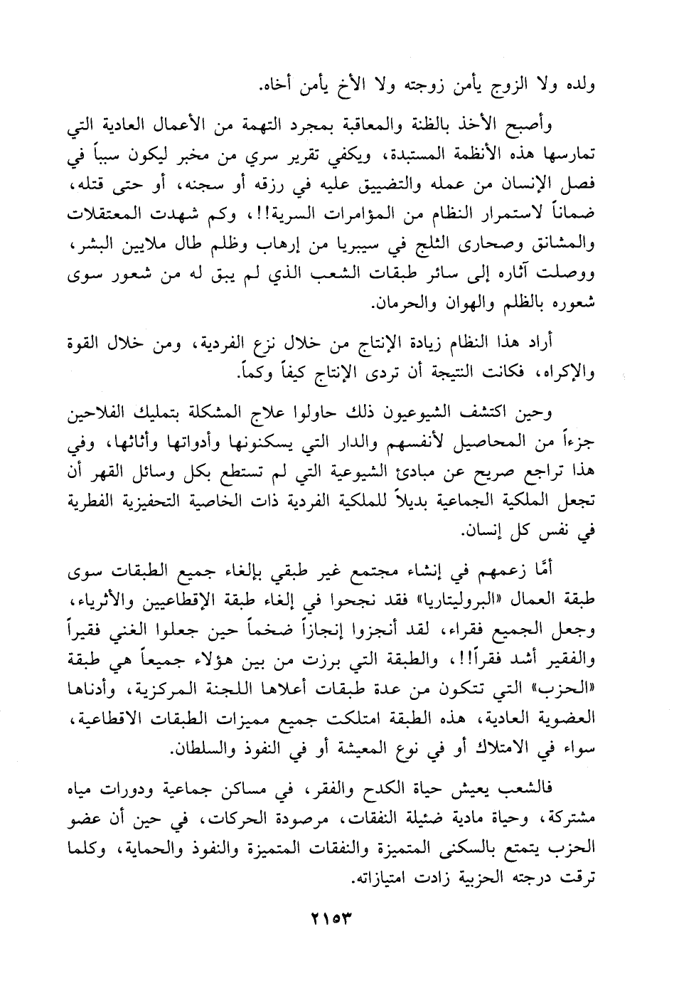 أمَّا زعمهم في إنشاء مجتمع غير طبقي بإلغاء جميع الطبقات سوى طبقة العمال "البروليتاريا" فقد نجحوا في إلغاء طبقة الإقطاعيين والأثرياء، وجعل الجميع فقراء، لقد أنجزوا إنجازًا ضخمًا حين جعلوا الغني فقيرًا والفقير أشد فقرًا! ! ، والطبقة التي برزت من بين هؤلاء جميعًا هي طبقة "الحزب" التي تتكون من عدة طبقات أعلاها اللجنة المركزية، وأدناها العضوية العادية، هذه الطبقة امتلكت جميع مميزات الطبقات الاقطاعية، سواء في الامتلاك أو في نوع المعيشة أو في النفوذ والسلطان.