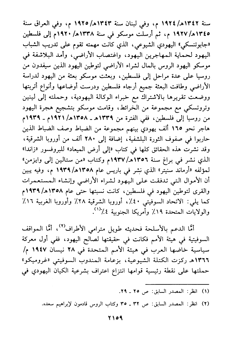 سنة ١٣٤٢ هـ/ ١٩٢٤ م، وفي لبنان سنة ١٣٤٣ هـ/ ١٩٢٥ م، وفي العراق سنة ١٣٤٥ هـ/ ١٩٢٧ م، ثم أرسلت موسكو في سنة ١٣٣٨ هـ/ ١٩٢٥ م إلى فلسطين "جابوتنسكي" اليهودي الشيوعي، الذي كانت مهمته تقوم على تدريب الشباب اليهود لحماية المهاجرين اليهود، واغتصاب الأراضي، وأمد البلاشفة في موسكو اليهود الروس بالمال لشراء الأراضي لتوطين اليهود الذين سيفدون من روسيا على عدة مراحل إلى فلسطين، وبعثت موسكو بعثة من اليهود لدراسة الأراضي وطافت البعثة جميع أرجاء فلسطين ودرست أوضاعها وأنواع أتربتها ووضعت تقريرها بالاشتراك مع خبراء الوكالة اليهودية، وحملته إلى لينين وتروتسكي مع مجموعة من الخرائط، وقامت موسكو بتشجيع هجرة اليهود من روسيا إلى فلسطين، ففي الفترة من ١٣٣٩ هـ - ١٣٥٨ هـ/ ١٩٢١ م - ١٩٣٩ م هاجر نحو ١٦٥ ألف يهودي بينهم مجموعة من الضباط وصف الضباط الذين حاربوا في صفوف الثورة البلشفية، إضافة إلى ٢٨٠ ألف من أوروبا الشرقية، وقد نشرت هذه الحقائق كلها في كتاب "إلى أرض الميعاد" للبروفسور "زاندا" الذي نشر في براغ سنة ١٣٥٦ هـ/ ١٩٣٧ م وكتاب "من ستالين إلى وايزمن" لمؤلفه "أرماند سنيتر" الذي نشر في باريس عام ١٣٥٨ هـ/ ١٩٣٩ م، وفيه يبين أن الأموال التي تدفقت على اليهود لشراء الأراضي وإنشاء المستعمرات والقرى لتوطين اليهود في فلسطين، كانت نسبتها حتى عام ١٣٥٨ هـ/ ١٩٣٩ م كما يلي: الاتحاد السوفيتي ٤٠ %، أوروبا الشرقية ٢٨ % وأوروبا الغربية ١٦ % والولايات المتحدة ١٩ % وأمريكا الجنوبية ٤ % (¬١).