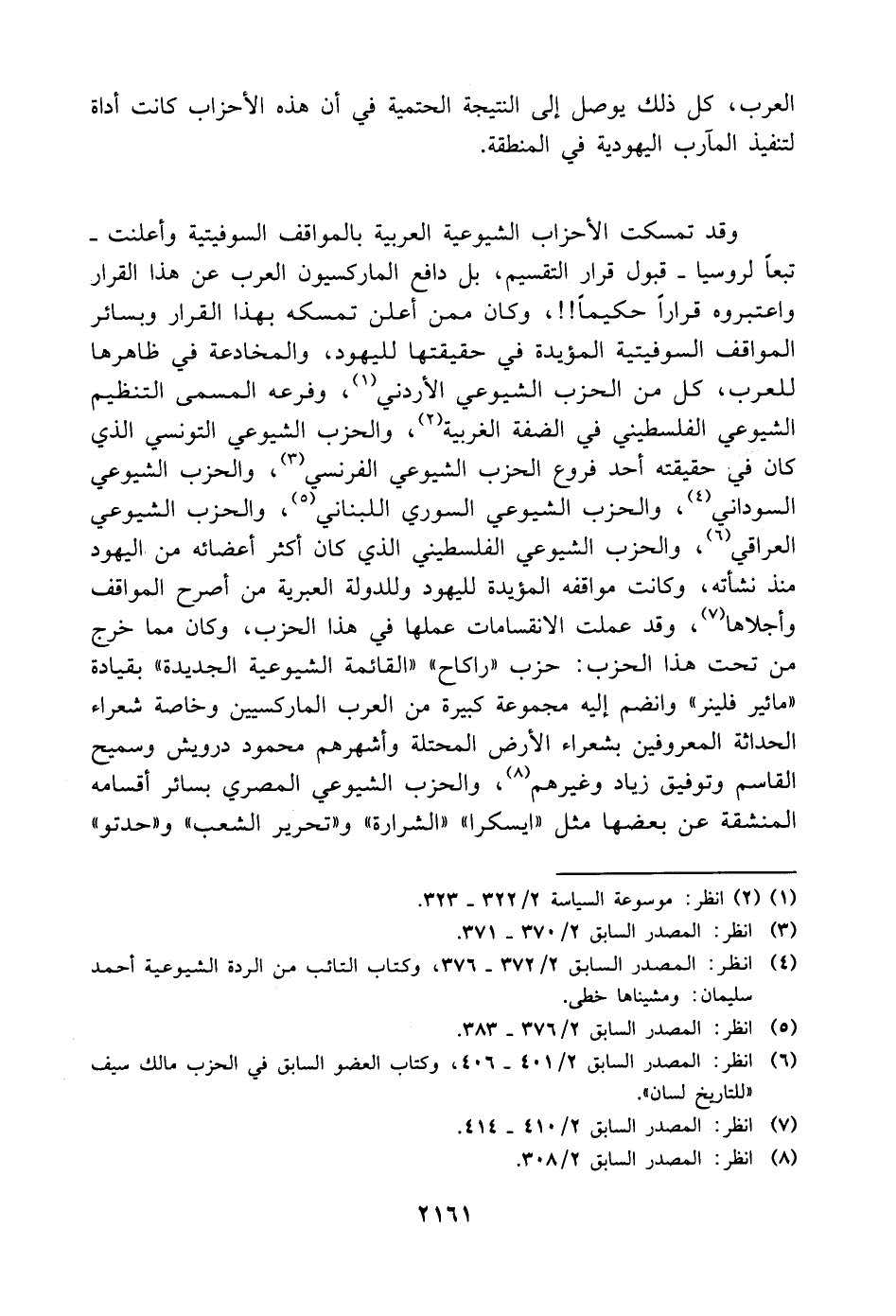 وقد تمسكت الأحزاب الشيوعية العربية بالمواقف السوفيتية وأعلنت -تبعًا لروسيا- قبول قرار التقسيم، بل دافع الماركسيون العرب عن هذا القرار واعتبروه قرارًا حكيمًا! ! ، وكان ممن أعلن تمسكه بهذا القرار وبسائر المواقف السوفيتية المؤيدة في حقيقتها لليهود، والمخادعة في ظاهرها للعرب، كل من الحزب الشيوعي الأردني (¬١)، وفرعه المسمى التنظيم الشيوعي الفلسطيني في الضفة الغربية (¬٢)، والحزب الشيوعي التونسي الذي كان في حقيقته أحد فروع الحزب الشيوعي الفرنسي (¬٣)، والحزب الشيوعي السوداني (¬٤)، والحزب الشيوعي السوري اللبناني (¬٥)، والحزب الشيوعي العراقي (¬٦)، والحزب الشيوعي الفلسطيني الذي كان أكثر أعضائه من اليهود منذ نشأته، وكانت مواقفه المؤيدة لليهود وللدولة العبرية من أصرح المواقف وأجلاها (¬٧)، وقد عملت الانقسامات عملها في هذا الحزب، وكان مما خرج من تحت هذا الحزب: حزب "راكاح" "القائمة الشيوعية الجديدة" بقيادة "مائير فلينر" وانضم إليه مجموعة كبيرة من العرب الماركسيين وخاصة شعراء الحداثة المعروفين بشعراء الأرض المحتلة وأشهرهم محمود درويش وسميح القاسم وتوفيق زياد وغيرهم (¬٨)، والحزب الشيوعي المصري بسائر أقسامه المنشقة عن بعضها مثل "ايسكرا" "الشرارة" و"تحرير الشعب" و"حدتو"