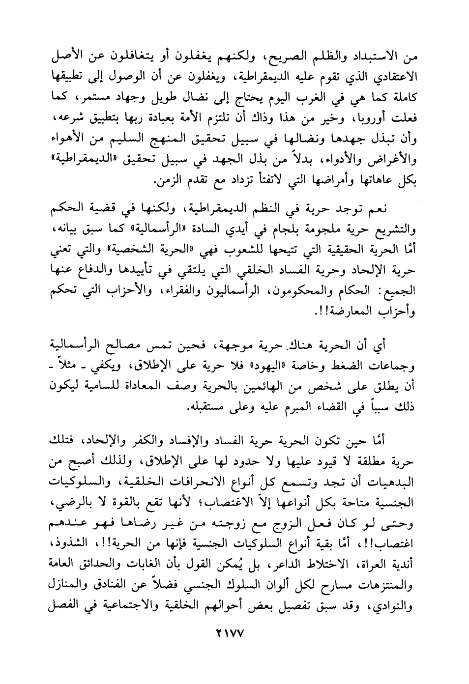 نعم توجد حرية في النظم الديمقراطية، ولكنها في قضية الحكم والتشريع حرية ملجومة بلجام في أيدي السادة "الرأسمالية" كما سبق بيانه، أمَّا الحرية الحقيقية التي تتيحها للشعوب فهي "الحرية الشخصية" والتي تعني حرية الإلحاد وحرية الفساد الخلقي التي يلتقي في تأييدها والدفاع عنها الجميع: الحكام والمحكومون، الرأسماليون والفقراء، والأحزاب التي تحكم وأحزاب المعارضة! ! .