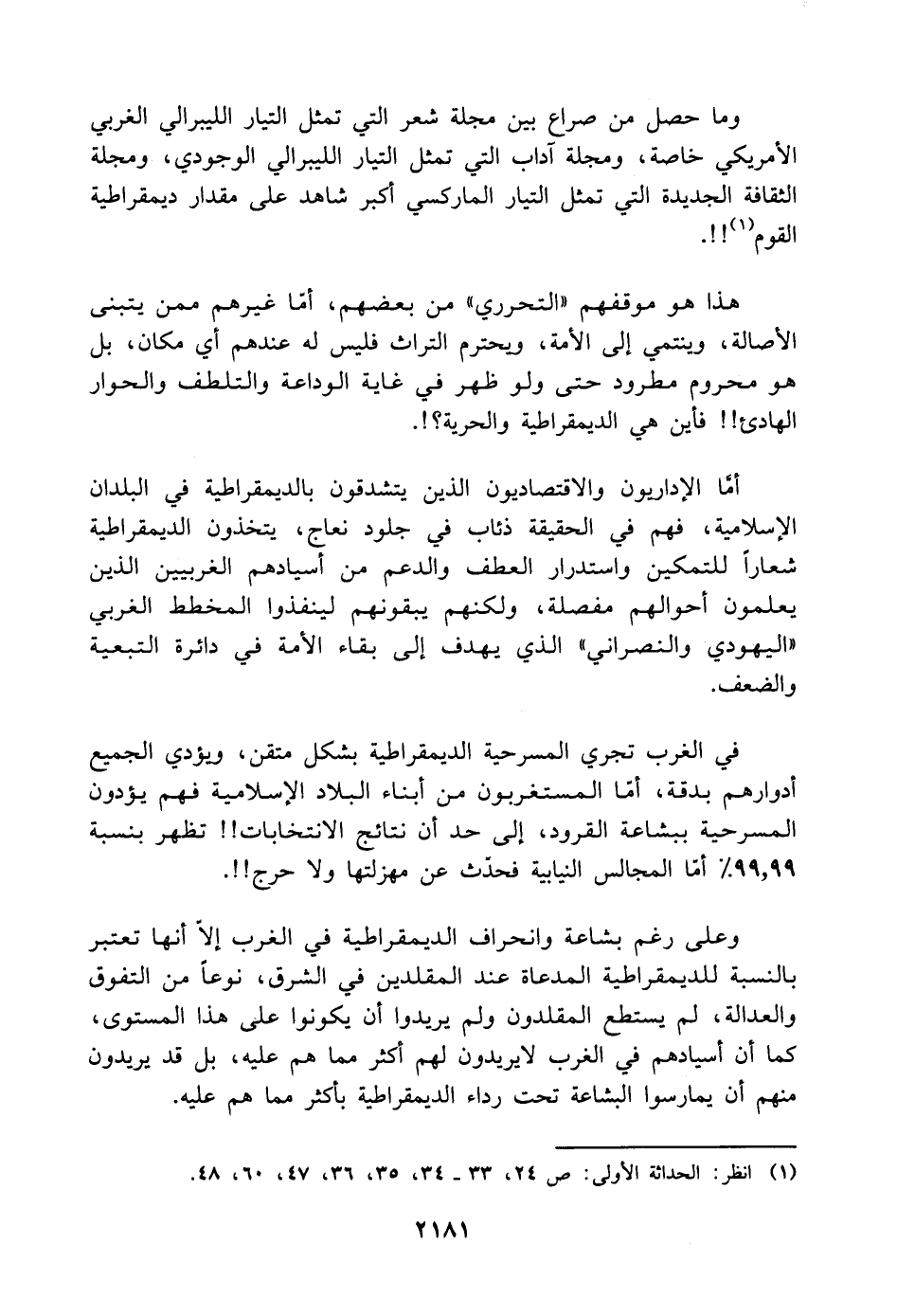 في الغرب تجري المسرحية الديمقراطية بشكل متقن، ويؤدي الجميع أدوارهم بدقة، أمّا المستغربون من أبناء البلاد الإسلامية فهم يؤدون المسرحية ببشاعة القرود، إلى حد أن نتائج الانتخابات! ! تظهر بنسبة ٩٩.٩٩ % أمّا المجالس النيابية فحدّث عن مهزلتها ولا حرج! ! .