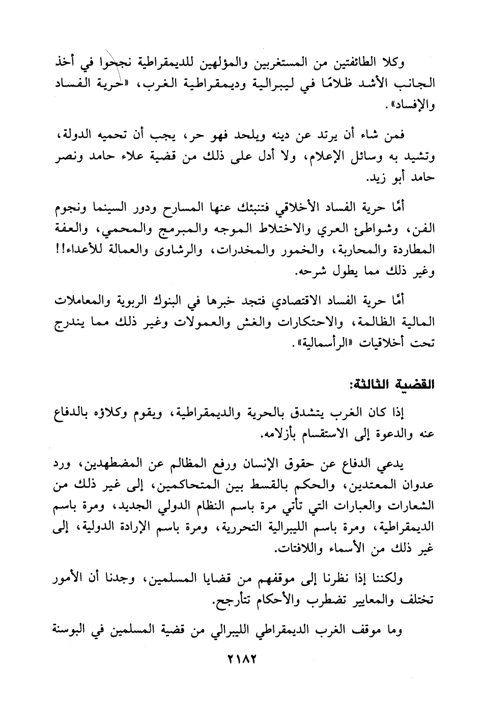 أمَّا حرية الفساد الأخلاقي فتنبئك عنها المسارح ودور السينما ونجوم الفن، وشواطئ العري والاختلاط الموجه والمبرمج والمحمي، والعفة المطاردة والمحاربة، والخمور والمخدرات، والرشاوى والعمالة للأعداء! ! وغير ذلك مما يطول شرحه.