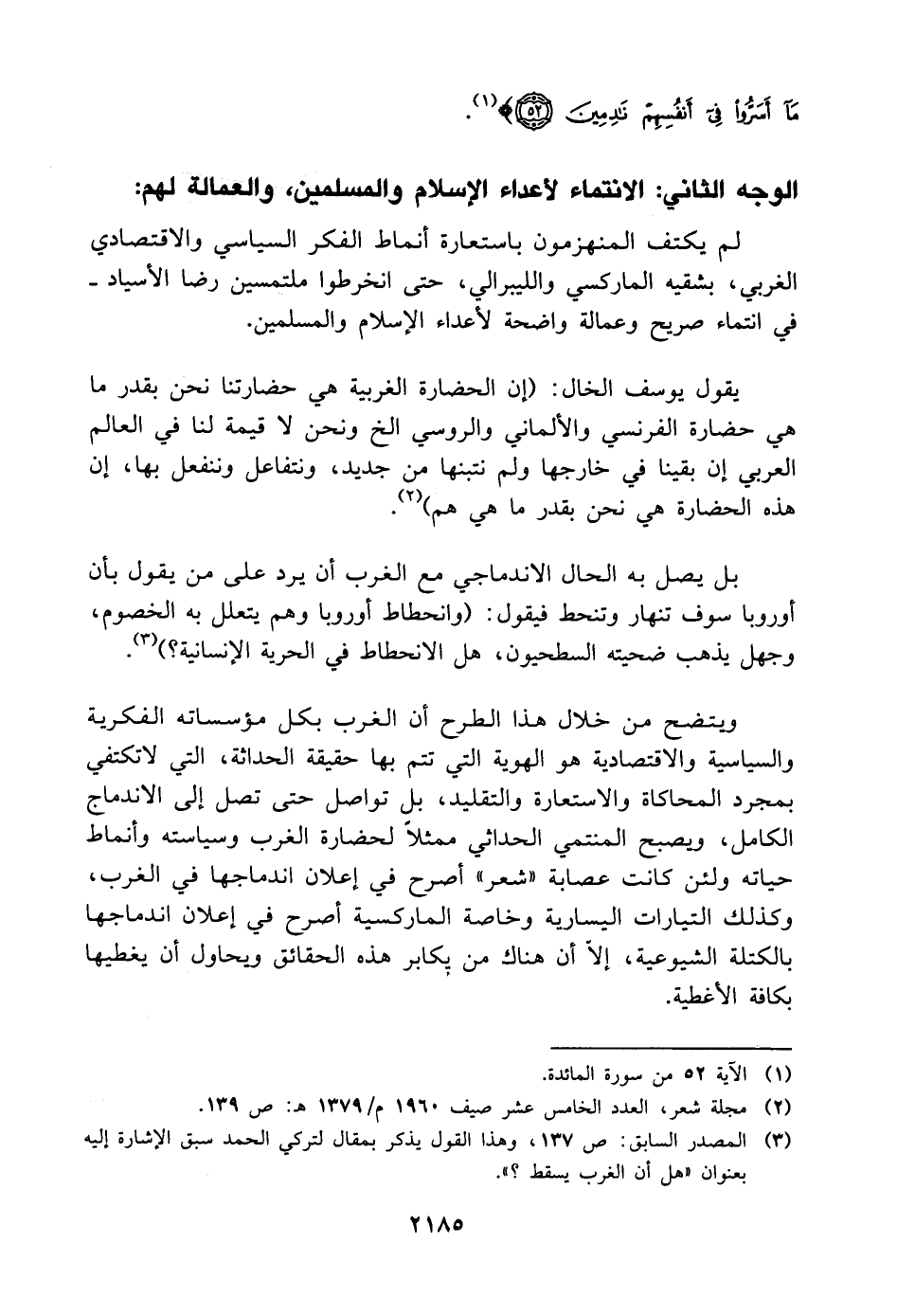(¬٣) المصدر السابق: ص ١٣٧، وهذا القول يذكر بمقال لتركي الحمد سبق الإشارة إليه بعنوان "هل أن الغرب يسقط؟ ".