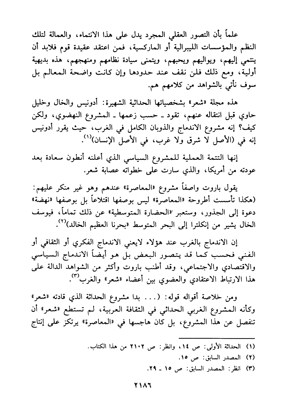 هذه مجلة "شعر" بشخصياتها الحداثية الشهيرة: أدونيس والخال وخليل حاوي قبل انتقاله عنهم، تقود -حسب زعمها- المشروع النهضوي، ولكن كيف؟ إنه مشروع الاندماج والذوبان الكامل في الغرب، حيث يقرر أدونيس إنه في (الأصل لا شرق ولا غرب، في الأصل الإنسان) (¬١).