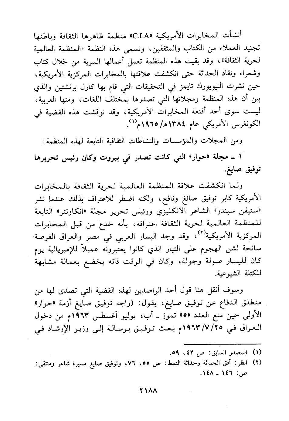 ولما انكشفت علاقة المنظمة العالمية لحرية الثقافة بالمخابرات الأمريكية كابر توفيق صائغ ونافح، ولكنه اضطر للاعتراف بذلك عندم! نشر "ستيفن سبندر" الشاعر الانكليزي ورئيس تحرير مجلة "انكاونتر" التابعة للمنظمة العالمية لحرية الثقافة اعترافه، بأنه خدع من قبل المخابرات المركزية الأمريكية (¬٢)، وقد وجد اليسار العربي في مصر والعراق الفرصة سانحة لشن الهجوم على التيار الذي كانوا يعتبرونه عميلًا للإمبريالية يوم كان لليسار صولة وجولة، وكان في الوقت ذاته يخضع بعمالة مشابهة للكتلة الشيوعية.