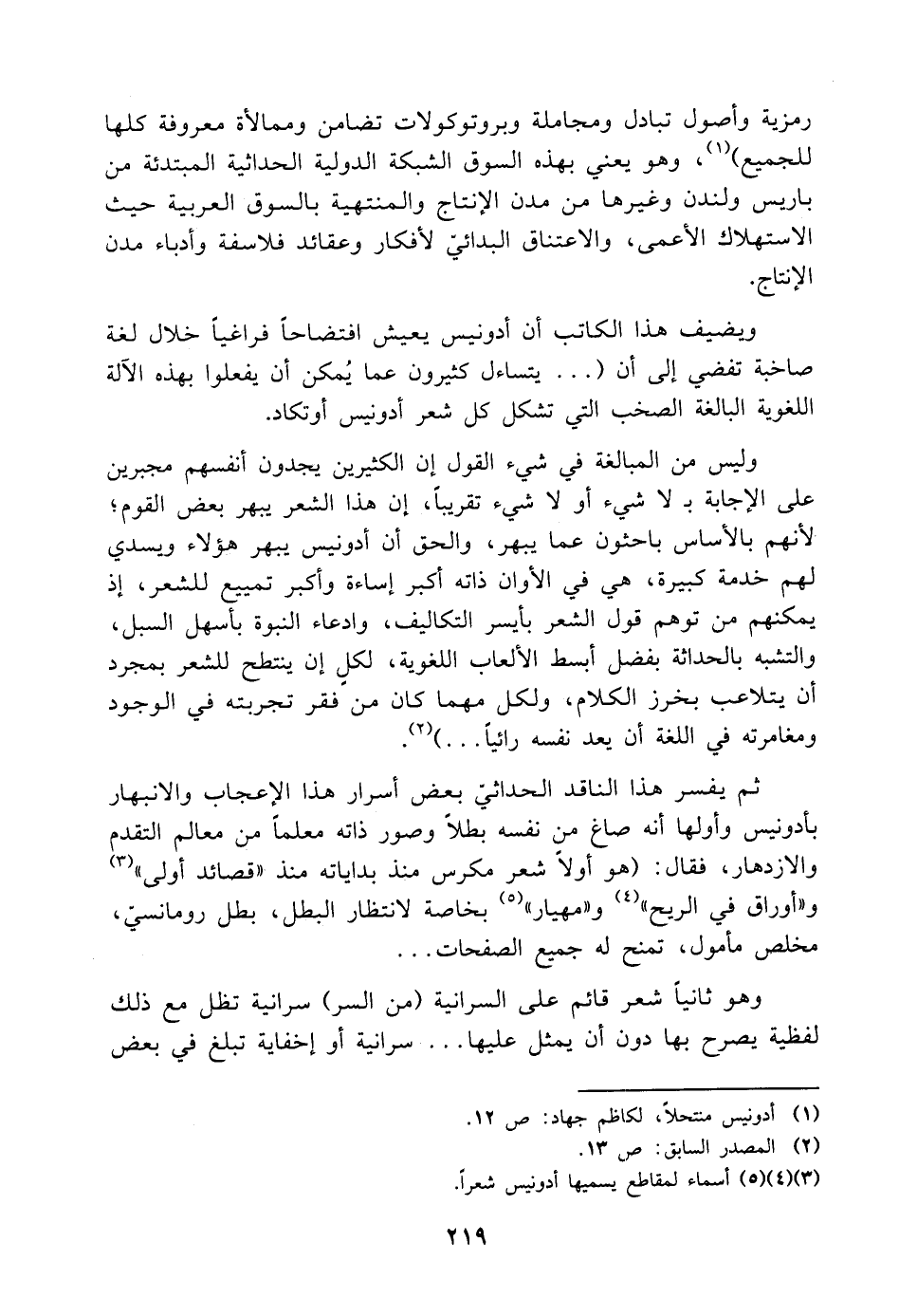 رمزية وأصول تبادل ومجاملة وبروتوكولات تضامن وممالأة معروفة كلها للجميع) (¬١)، وهو يعني بهذه السوق الشبكة الدولية الحداثية المبتدئة من باريس ولندن وغيرها من مدن الإنتاج والمنتهية بالسوق العربية حيث الاستهلاك الأعمى، والاعتناق البدائي لأفكار وعقائد فلاسفة وأدباء مدن الإنتاج.