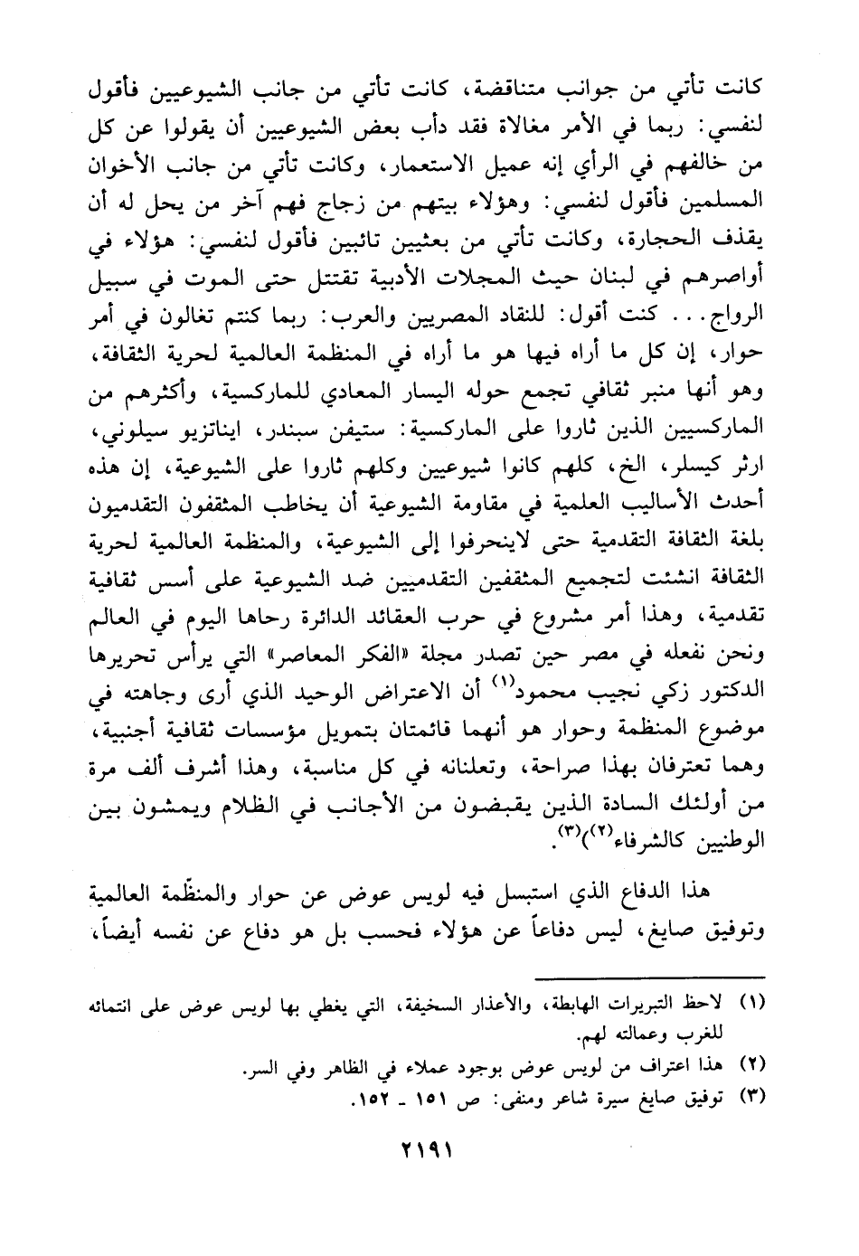 هذا الدفاع الذي استبسل فيه لويس عوض عن حوار والمنظّمة العالمية وتوفيق صايغ، ليس دفاعًا عن هؤلاء فحسب بل هو دفاع عن نفسه أيضًا،