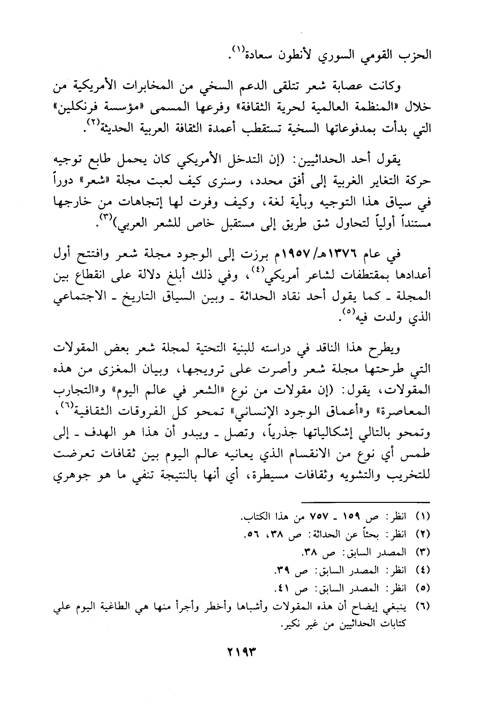 في عام ١٣٧٦ هـ/ ١٩٥٧ م برزت إلى الوجود مجلة شعر وافتتح أول أعدادها بمقتطفات لشاعر أمريكي (¬٤)، وفي ذلك أبلغ دلالة على انقطاع بين المجلة -كما يقول أحد نقاد الحداثة- وبين السياق التاريخ - الاجتماعي الذي ولدت فيه (¬٥).