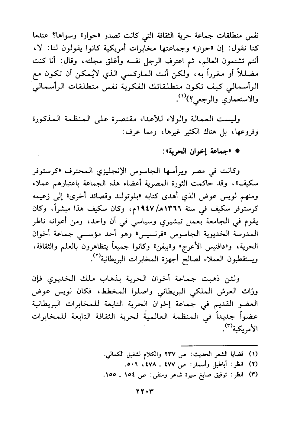 نفس منطلقات جماعة حرية الثقافة التي كانت تصدر "حوار" وسواها؟ عندما كنا نقول: إن "حوار" وجماعتها مخابرات أمريكية كانوا يقولون لنا: لا، أنتم تشتمون العالم، ثم اعترف الرجل نفسه وأغلق مجلته، وقال: أنا كنت مضللًا أو مغررًا به، ولكن أنت الماركسي الذي لا يُمكن أن تكون مع الرأسمالي كيف تكون منطلقاتك الفكرية نفس منطلقات الرأسمالي والاستعماري والرجعي؟ ) (¬١).
