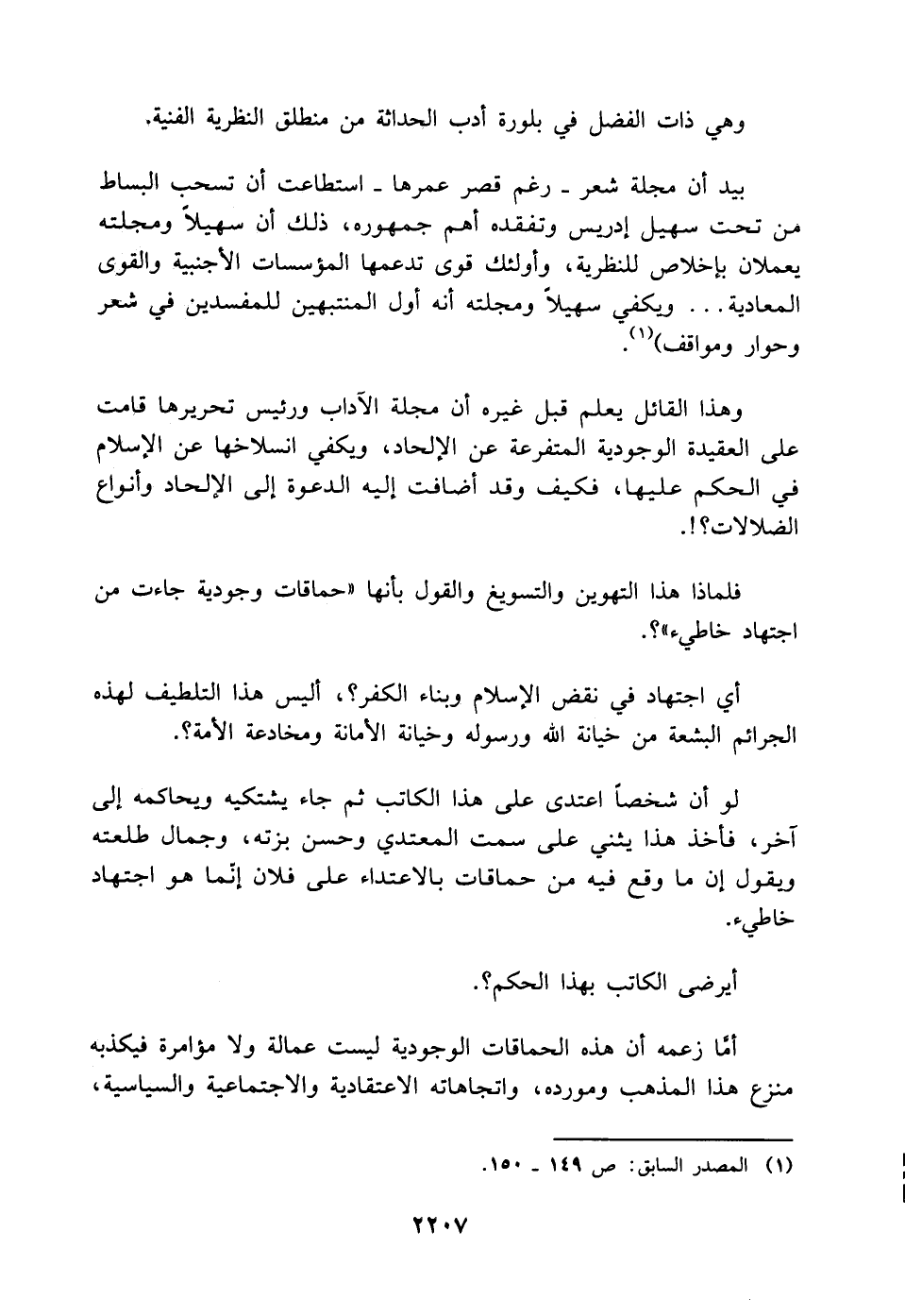 وهذا القائل يعلم قبل غيره أن مجلة الآداب ورئيس تحريرها قامت على العقيدة الوجودية المتفرعة عن الإلحاد، ويكفي انسلاخها عن الإسلام في الحكم عليها، فكيف وقد أضافت إليه الدعوة إلى الإلحاد وأنواع الضلالات؟ ! .